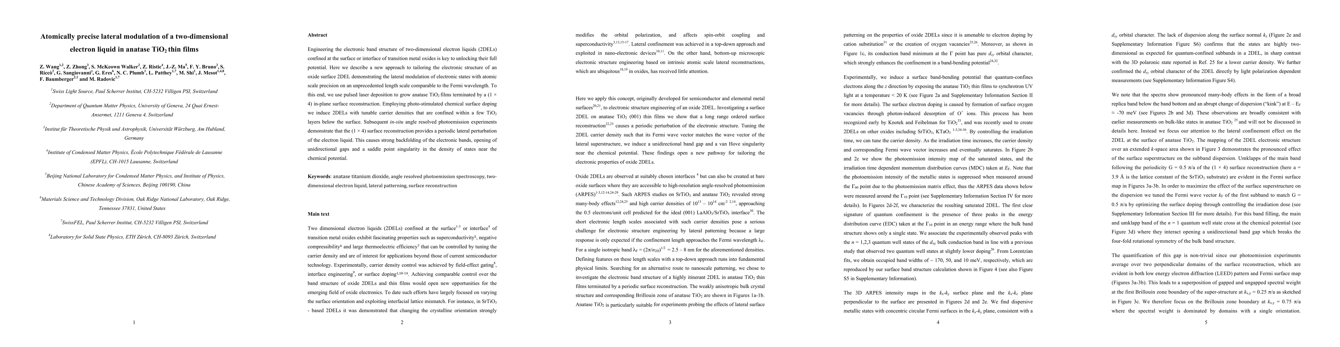 This paper details a novel method for precisely modulating the electronic structure of two-dimensional electron liquids (2DELs) in anatase TiO2 thin films using pulsed laser deposition and photo-stimulated chemical surface doping. The study reveals that the (1 x 4) surface reconstruction induces significant changes in the electronic bands, leading to unique phenomena such as unidirectional gaps and a saddle point singularity.