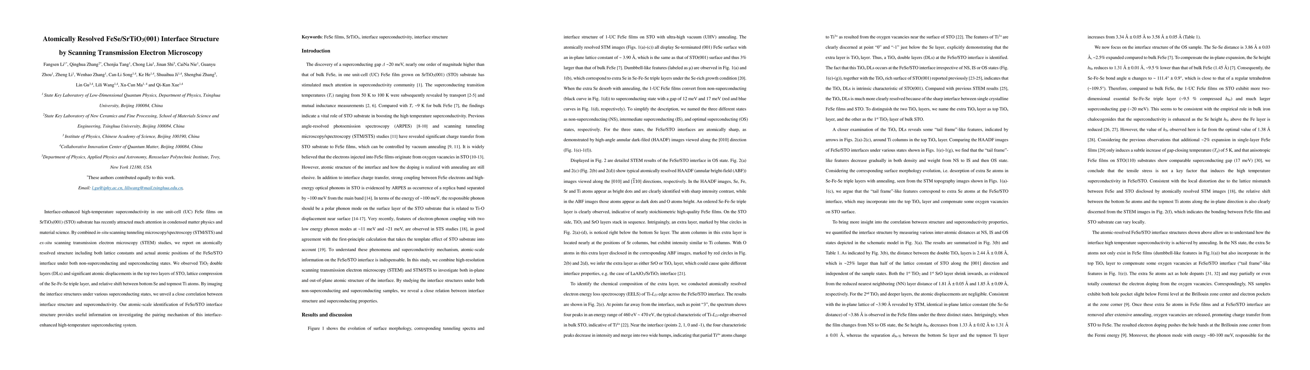 This paper uses scanning transmission electron microscopy (STEM) to provide atomically resolved details of the FeSe/SrTiO3 interface, revealing significant atomic displacements and lattice distortions that correlate closely with superconducting properties. The study identifies structural features influencing the high-temperature superconductivity observed in FeSe films on SrTiO3 substrates.