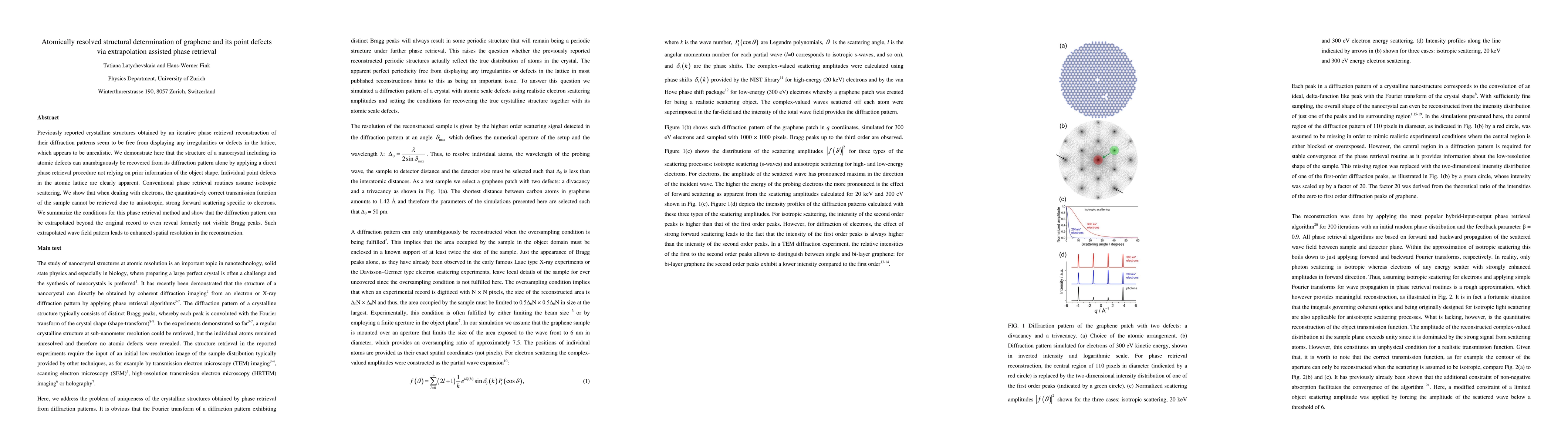 Previously reported crystalline structures obtained by an iterative phase retrieval reconstruction of their diffraction patterns seem to be free from displaying any irregularities or defects in the lattice, which appears to be unrealistic. We demonstrate here that the structure of a nanocrystal including its atomic defects can unambiguously be recovered from its diffraction pattern alone by applying a direct phase retrieval procedure not relying on prior information of the object shape. Individual point defects in the atomic lattice are clearly apparent. Conventional phase retrieval routines assume isotropic scattering. We show that when dealing with electrons, the quantitatively correct transmission function of the sample cannot be retrieved due to anisotropic, strong forward scattering specific to electrons. We summarize the conditions for this phase retrieval method and show that the diffraction pattern can be extrapolated beyond the original record to even reveal formerly not visible Bragg peaks. Such extrapolated wave field pattern leads to enhanced spatial resolution in the reconstruction.