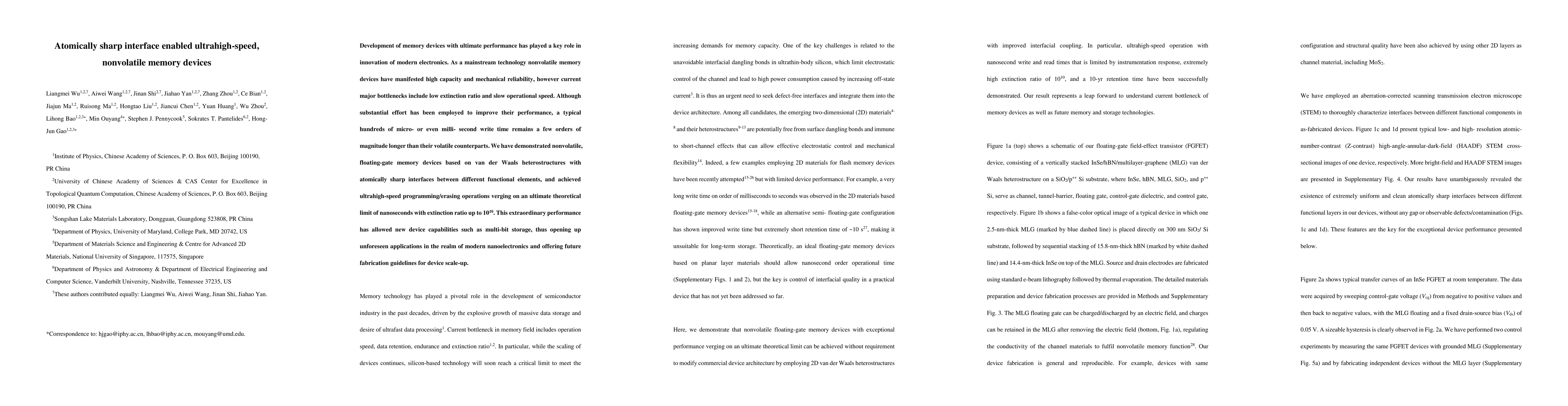 This paper presents nonvolatile memory devices based on van der Waals heterostructures with atomically sharp interfaces, achieving ultrahigh-speed programming/erasing operations in nanoseconds and an extinction ratio of up to 10^10, enabling multi-bit storage and new applications in nanoelectronics.