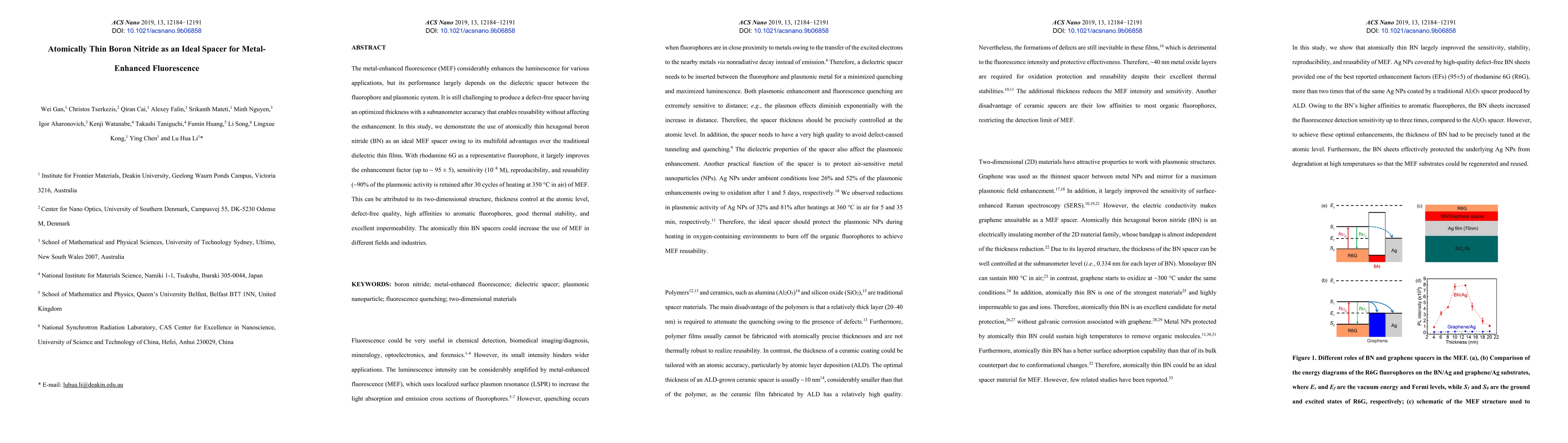 This paper demonstrates that atomically thin hexagonal boron nitride (BN) serves as an ideal spacer for metal-enhanced fluorescence (MEF), significantly improving enhancement factor, sensitivity, reproducibility, and reusability due to its atomic-level thickness control, defect-free quality, and excellent thermal stability.