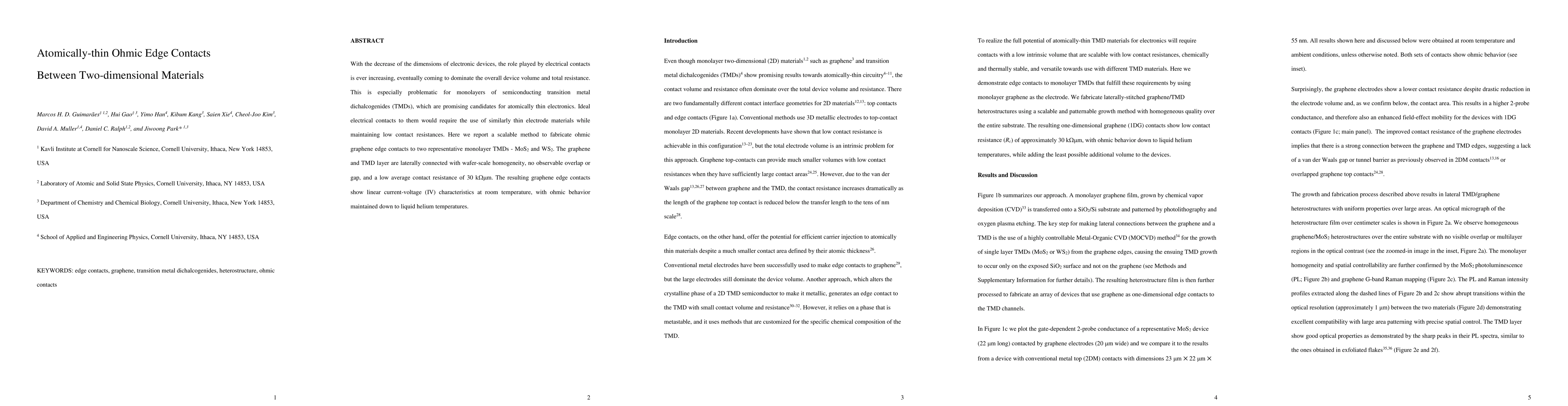 The paper introduces a scalable method for fabricating one-dimensional ohmic edge contacts between monolayer graphene and semiconducting TMDs, ensuring minimal electrode volume and contact area.
