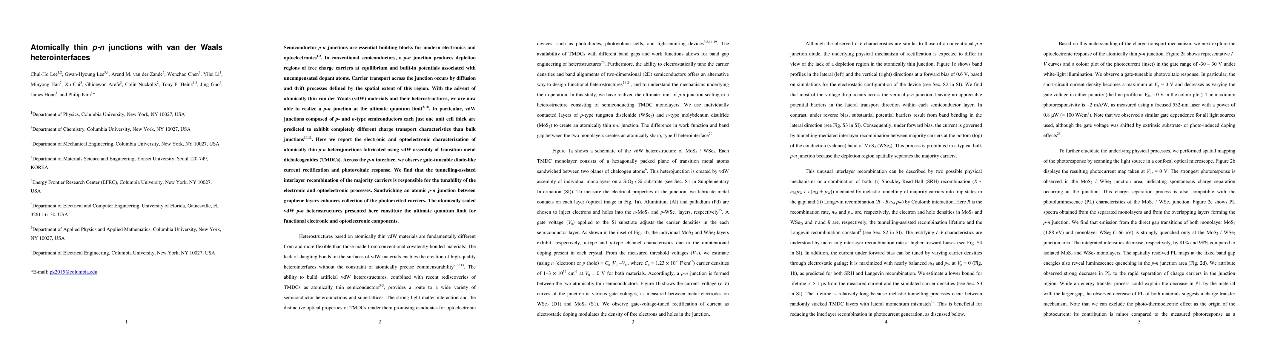 This paper reports the fabrication and characterization of atomically thin p-n junctions formed via van der Waals assembly of transition metal dichalcogenides, demonstrating gate-tuneable diode-like current rectification and photovoltaic response due to tunnelling-assisted interlayer recombination. Sandwiching these junctions between graphene layers enhances photoexcited carrier collection.