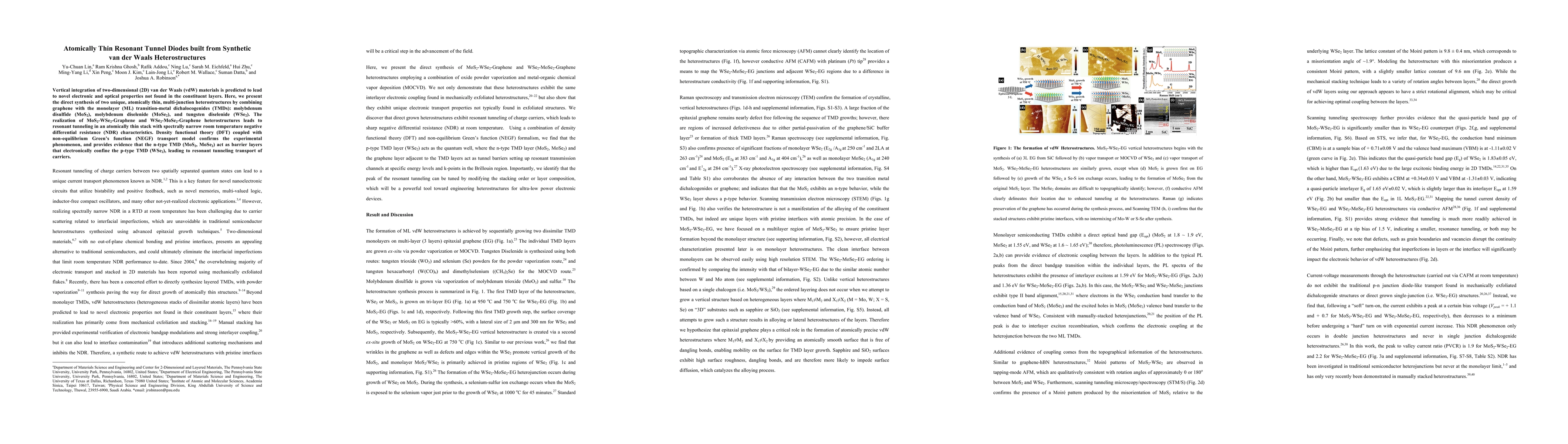 This paper details the synthesis of atomically thin resonant tunnel diodes from van der Waals heterostructures combining graphene with monolayer transition-metal dichalcogenides, showing novel electronic properties including room temperature negative differential resistance with spectrally narrow characteristics. The heterostructures demonstrate resonant tunneling in a vertical integration of two-dimensional materials.