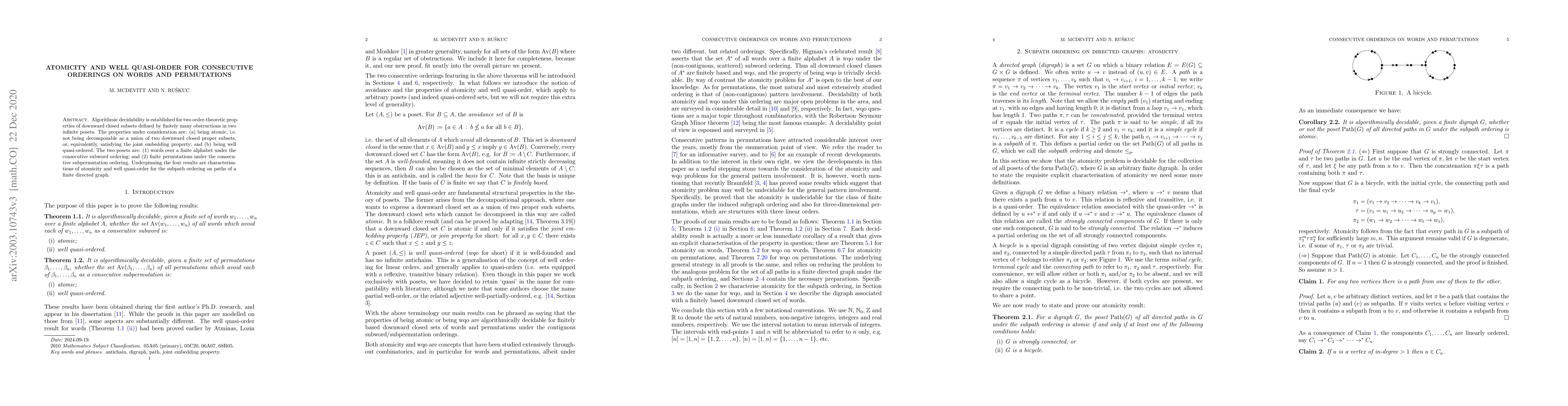 Researchers establish algorithmic decidability for two order-theoretic properties in infinite posets: atomicity and well quasi-order for words and permutations under consecutive ordering.