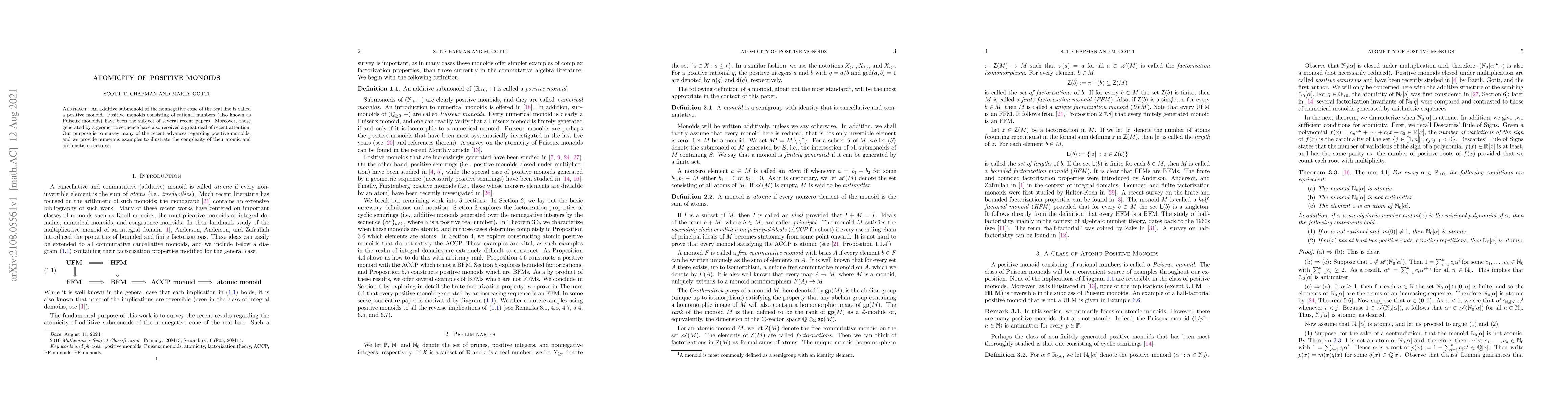 An additive submonoid of the nonnegative cone of the real line is called a positive monoid. Positive monoids consisting of rational numbers (also known as Puiseux monoids) have been the subject of several recent papers. Moreover, those generated by a geometric sequence have also received a great deal of recent attention. Our purpose is to survey many of the recent advances regarding positive monoids, and we provide numerous examples to illustrate the complexity of their atomic and arithmetic structures.
