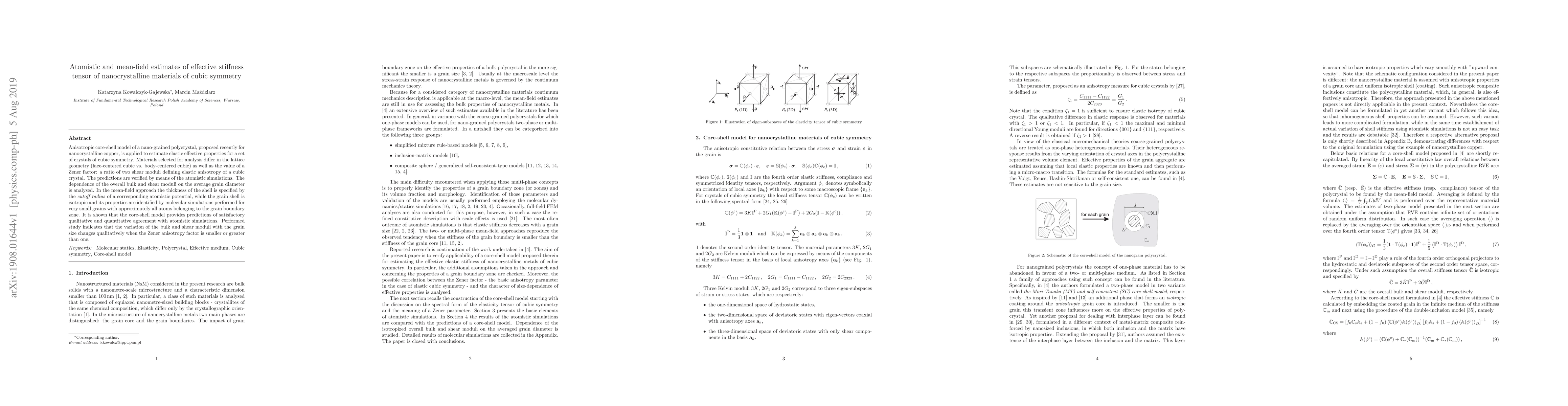 This paper applies an anisotropic core-shell model to estimate the effective stiffness tensor of cubic nanocrystalline materials, comparing predictions with atomistic simulations. It finds that the model's predictions align well with simulations, and shows that the relationship between bulk/shear moduli and grain size varies depending on the Zener anisotropy factor.
