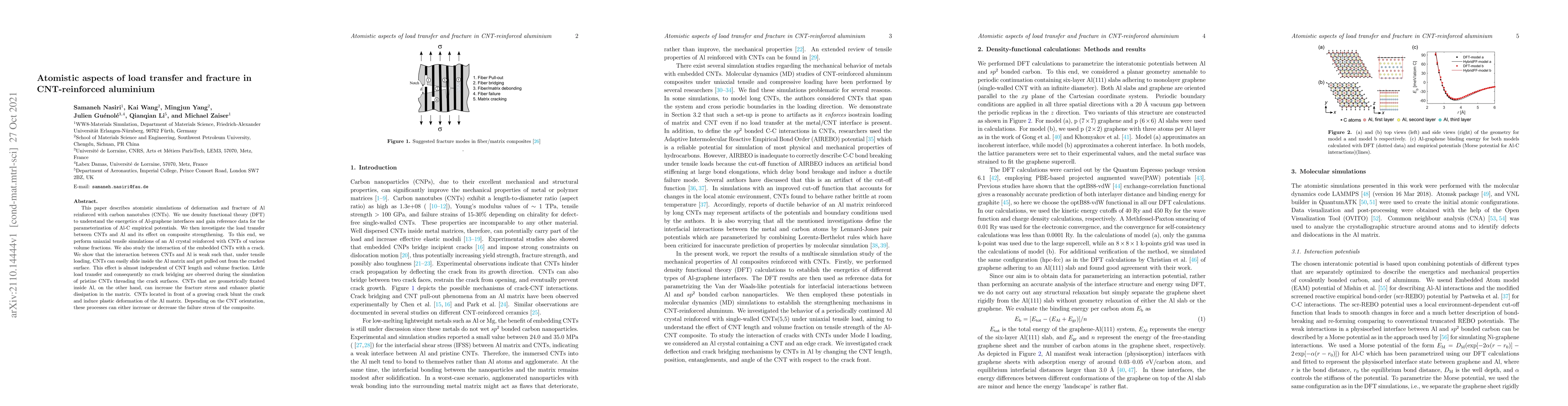 This paper uses atomistic simulations to study the load transfer and fracture behavior of CNT-reinforced aluminum, revealing that CNTs can slide within the Al matrix without significant load transfer, leading to easy pull-out and minimal crack bridging. Fixed CNTs, however, can enhance fracture stress and plastic dissipation by blunting cracks and inducing plastic deformation.