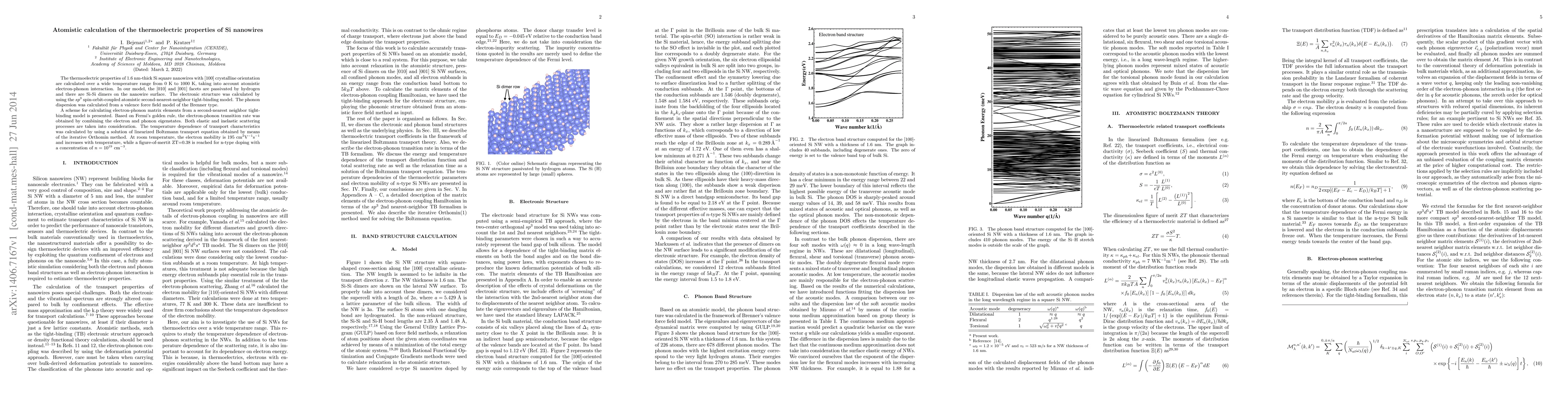 This study investigates the thermoelectric properties of 1.6 nm-thick Si nanowires using atomistic calculations, revealing an electron mobility of 195 cm^2/(Vs) at room temperature and a ZT value of 0.38 for n-type doping at 10^19 cm^-3. The model considers electron-phonon interactions and surface passivation effects.
