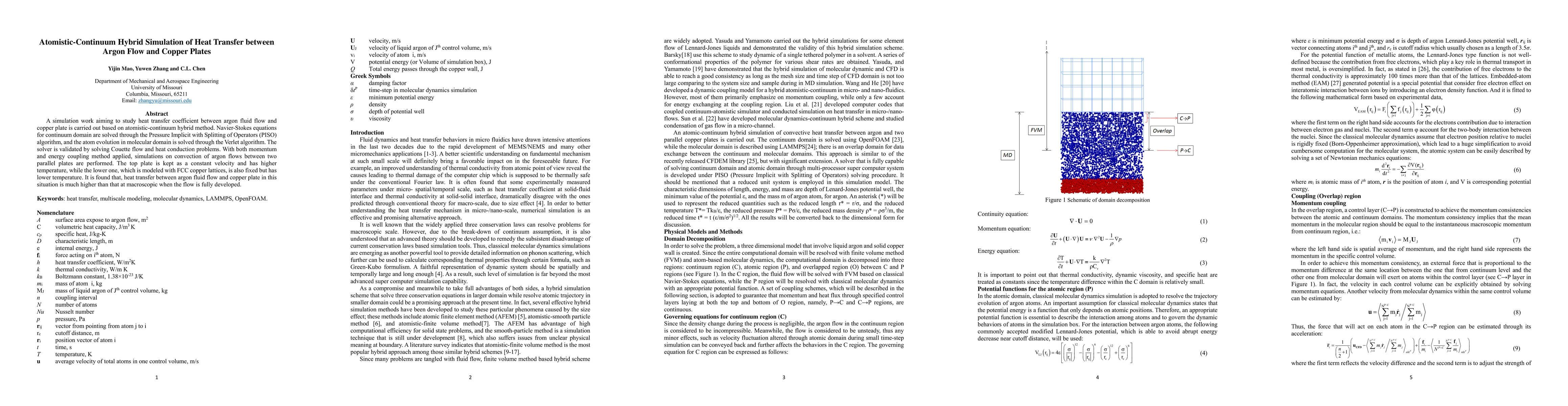 This paper employs an atomistic-continuum hybrid simulation to study the heat transfer coefficient between flowing argon and copper plates. The study finds that heat transfer is significantly higher than macroscopic predictions when the argon flow is fully developed.