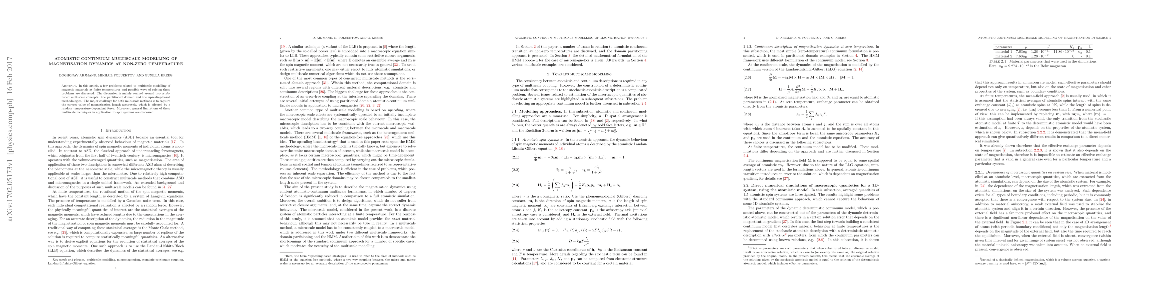 In this article, a few problems related to multiscale modelling of magnetic materials at finite temperatures and possible ways of solving these problems are discussed. The discussion is mainly centred around two established multiscale concepts: the partitioned domain and the upscaling-based methodologies. The major challenge for both multiscale methods is to capture the correct value of magnetisation length accurately, which is affected by a random temperature-dependent force. Moreover, general limitations of these multiscale techniques in application to spin systems are discussed.