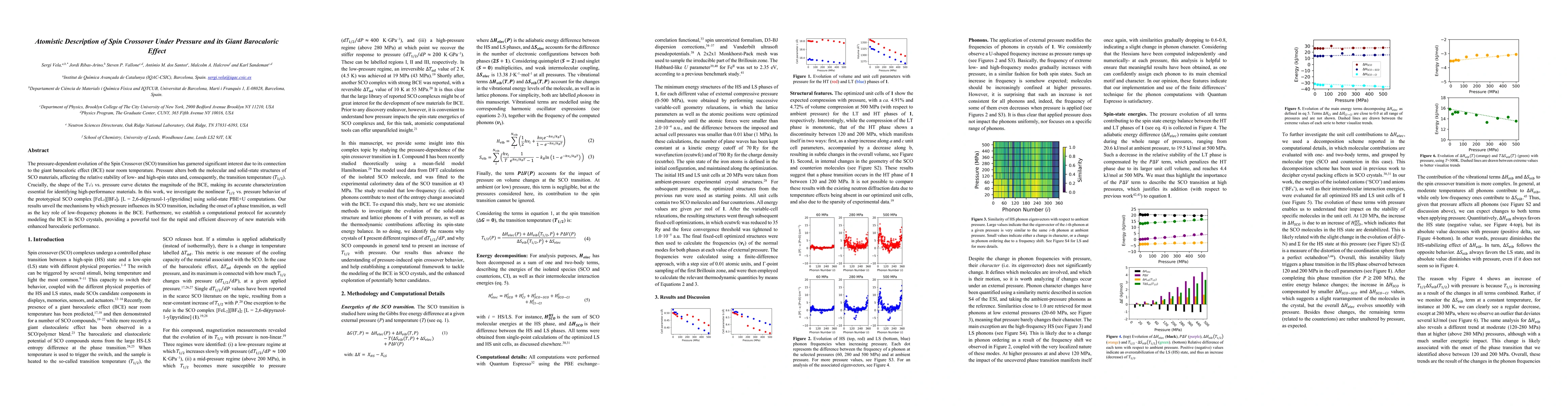The pressure-dependent evolution of the spin crossover (SCO) transition has garnered significant interest due to its connection to the giant barocaloric effect (BCE) near room temperature. Pressure alters both the molecular and solid-state structures of SCO materials, affecting the relative stability of low- and high-spin states and, consequently, the transition temperature ($T_{1/2}$). Crucially, the shape of the $T_{1/2}$ vs. pressure curve dictates the magnitude of the BCE, making its accurate characterization essential for identifying high-performance materials. In this work, we investigate the nonlinear $T_{1/2}$ vs. pressure behavior of the prototypical SCO complex [FeL$_2$][BF$_4$]$_2$ [L = 2,6-di(pyrazol-1-yl)pyridine] using solid-state PBE+U computations. Our results unveil the mechanisms by which pressure influences its SCO transition, including the onset of a phase transition, as well as the key role of low-frequency phonons in the BCE. Furthermore, we establish a computational protocol for accurately modeling the BCE in SCO crystals, providing a powerful tool for the rapid and efficient discovery of new materials with enhanced barocaloric performance.