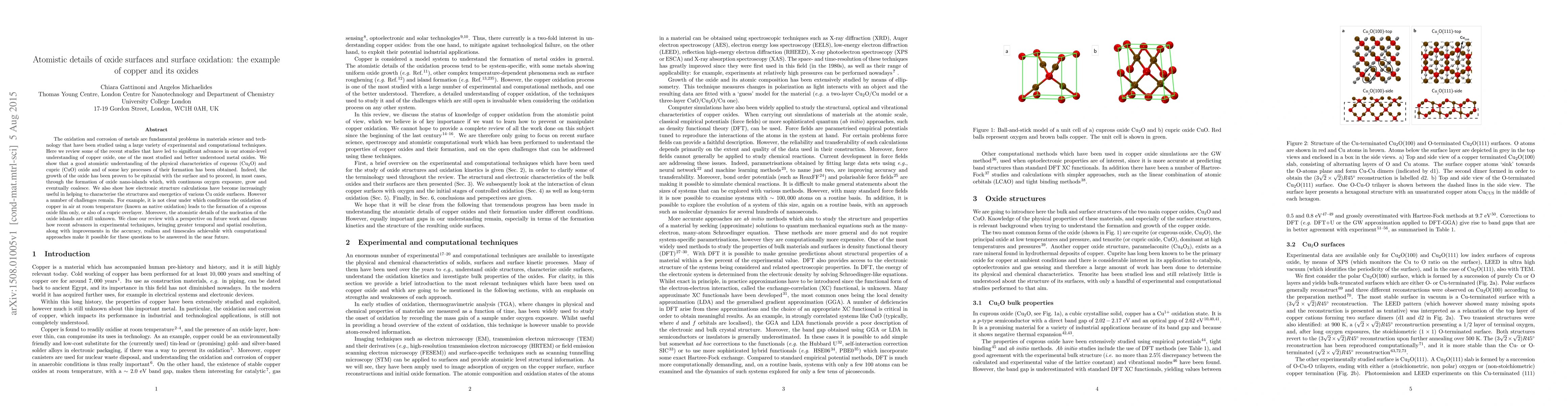 This paper reviews recent advances in understanding the atomic-level processes of copper oxide formation, highlighting the epitaxial growth of cuprous (Cu$_2$O) and cupric (CuO) oxides through oxide nano-islands. It underscores the utility of electronic structure calculations in characterizing these oxides but notes ongoing challenges in determining the conditions for native oxidation and the nucleation of oxide islands.
