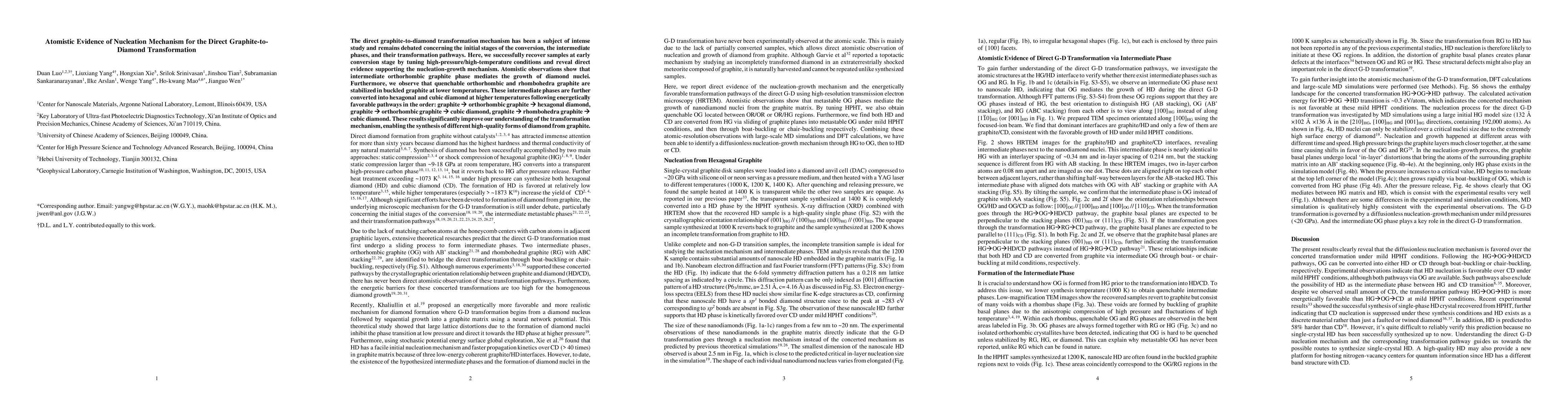 This study uncovers the atomistic details of the direct graphite-to-diamond transformation, revealing a nucleation-growth mechanism mediated by an intermediate orthorhombic graphite phase. The pathway involves graphite transforming into orthorhombic graphite and then into hexagonal or cubic diamond, offering insights into synthesizing high-quality diamond forms.