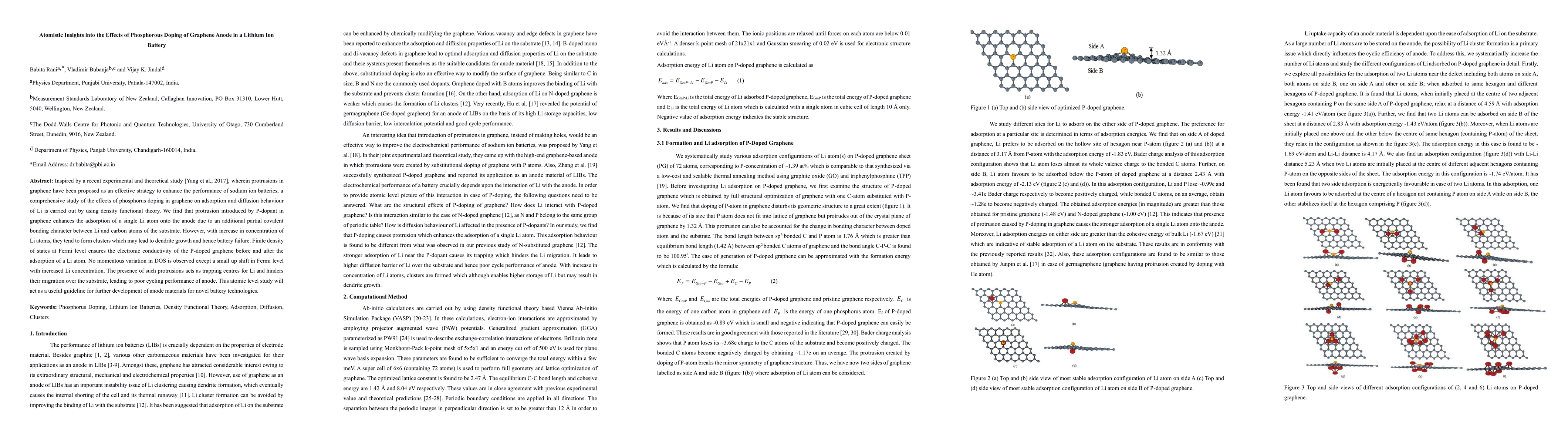 The study uses density functional theory to investigate phosphorus doping in graphene anodes for lithium-ion batteries. It finds that protrusions from P-dopants enhance single Li atom adsorption due to extra covalent bonding, but high Li concentrations can lead to clusters causing dendrite growth and battery failure. The doped graphene maintains electronic conductivity, but trapped Li atoms hinder migration, resulting in poor anode cycling performance. The research provides atomic-level insights for developing better anode materials in battery technology.