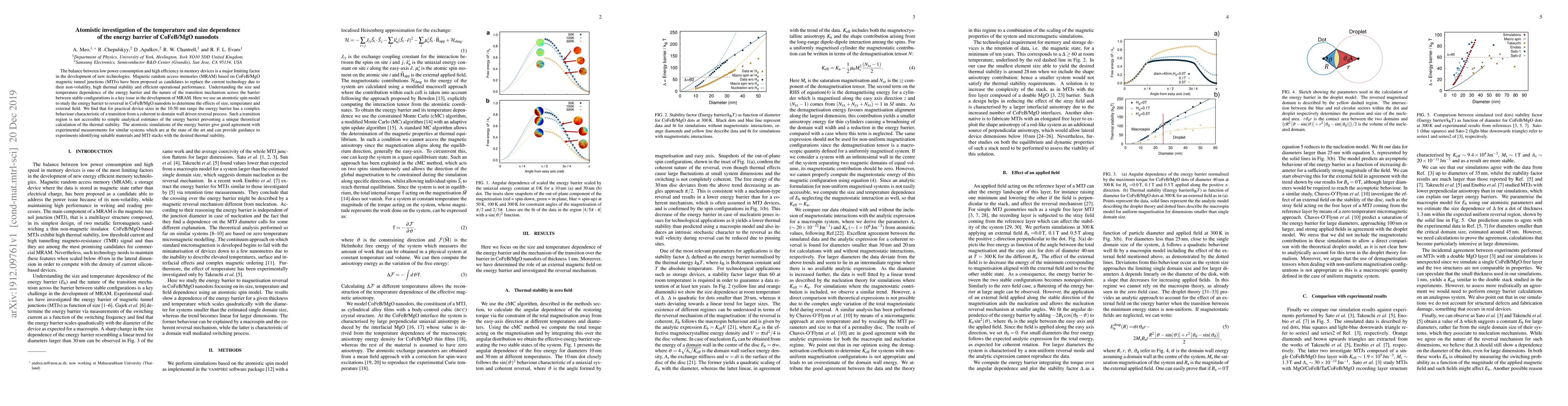 Researchers used an atomistic spin model to study the energy barrier in CoFeB/MgO nanodots and found a complex behavior that transitions from coherent to domain wall-driven reversal with increasing size and temperature. The simulations provide guidance for identifying suitable materials and MTJ stacks for thermal stability.