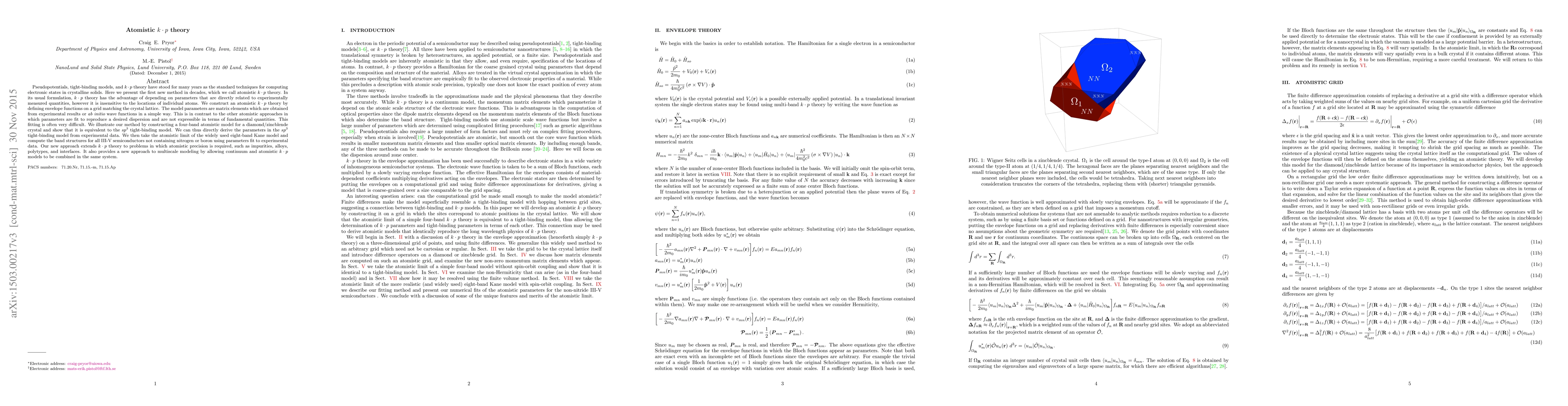 Pseudopotentials, tight-binding models, and $k\cdot p$ theory have stood for many years as the standard techniques for computing electronic states in crystalline solids. Here we present the first new method in decades, which we call atomistic $k\cdot p$ theory. In its usual formulation, $k\cdot p$ theory has the advantage of depending on parameters that are directly related to experimentally measured quantities, however it is insensitive to the locations of individual atoms. We construct an atomistic $k\cdot p$ theory by defining envelope functions on a grid matching the crystal lattice. The model parameters are matrix elements which are obtained from experimental results or {\it ab initio} wave functions in a simple way. This is in contrast to the other atomistic approaches in which parameters are fit to reproduce a desired dispersion and are not expressible in terms of fundamental quantities. This fitting is often very difficult. We illustrate our method by constructing a four-band atomistic model for a diamond/zincblende crystal and show that it is equivalent to the $sp^3$ tight-binding model. We can thus directly derive the parameters in the $sp^3$ tight-binding model from experimental data. We then take the atomistic limit of the widely used eight-band Kane model and compute the band structures for all III-V semiconductors not containing nitrogen or boron using parameters fit to experimental data. Our new approach extends $k\cdot p$ theory to problems in which atomistic precision is required, such as impurities, alloys, polytypes, and interfaces. It also provides a new approach to multiscale modeling by allowing continuum and atomistic $k\cdot p$ models to be combined in the same system.