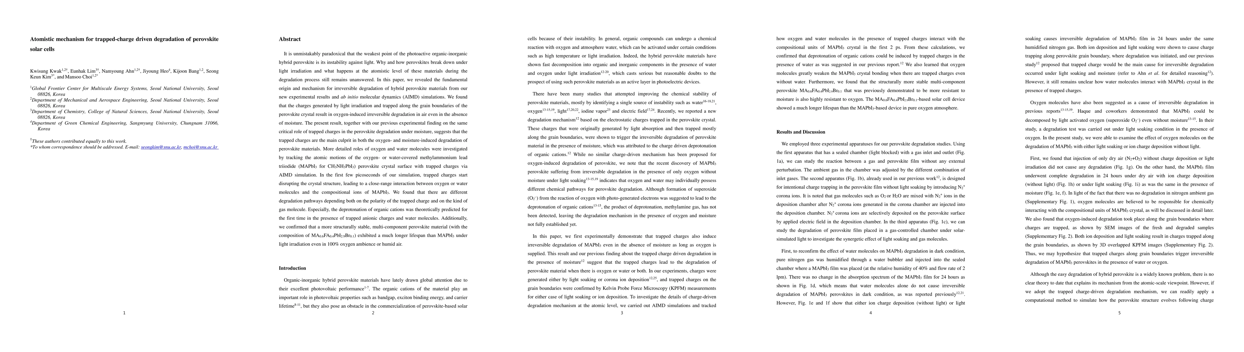 This paper elucidates the atomistic mechanism behind the degradation of perovskite solar cells, revealing that trapped photo-generated charges at grain boundaries cause irreversible degradation via oxygen interaction, even without moisture. The study combines experimental results and ab initio molecular dynamics simulations to show that trapped charges disrupt the crystal structure, leading to different degradation pathways based on charge polarity and gas molecule type.