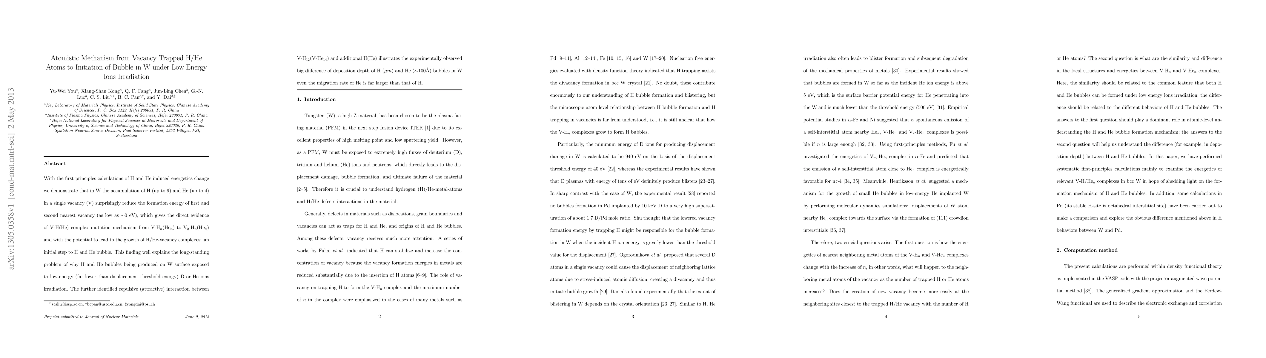 With the first principles calculations of H and He induced energetics change we demonstrate that in W the accumulation of H (up to 9) and He (up to 4) in a single vacancy (V) surprisingly reduce the formation energy of first and second nearest vacancy (as low as 0 eV), which gives the direct evidence of V-H (He) complex mutation mechanism from V-Hn (Hen) to V2-Hn (Hen) and with the potential to lead to the growth of H (He)-vacancy complexes: an initial step to H and He bubble. This finding well explains the long-standing problem of why H and He bubbles being produced on W surface exposed to low-energy (far lower than displacement threshold energy) D or He ions irradiation. The further identified repulsive (attractive) interaction between V-H12 (V-He14) and additional H (He) illustrates the experimentally observed big difference of deposition depth of H (micron) and He (100 angstrom) bubbles in W even the migration rate of He is far larger than that of H.