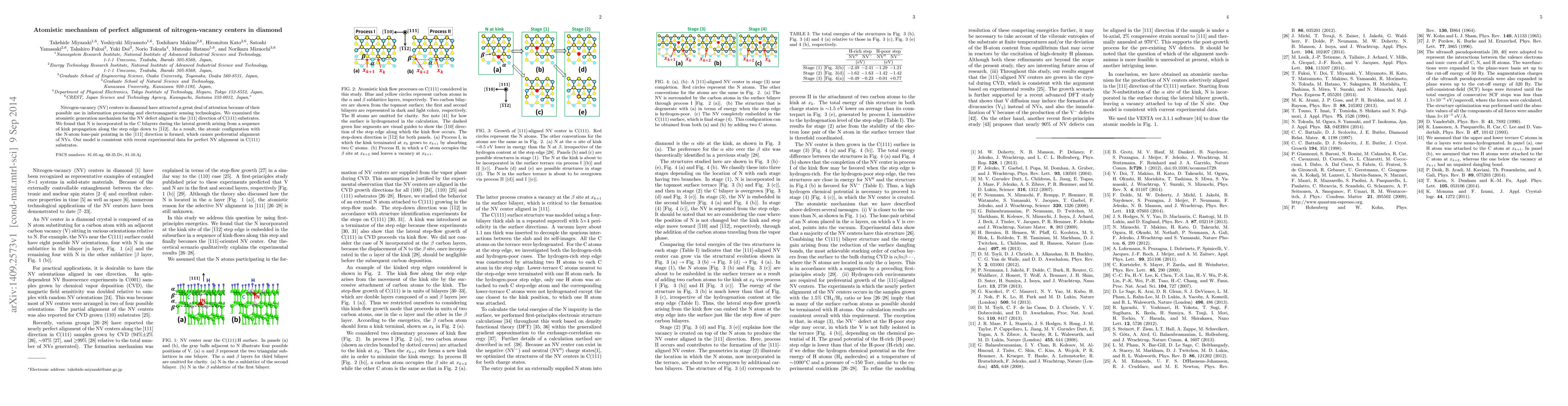 This paper explores the atomistic mechanism behind the perfect alignment of nitrogen-vacancy (NV) centers in diamond along the [111] direction, revealing that nitrogen incorporation occurs during lateral growth via kink propagation along the step edge. This results in NVs preferentially aligning in the desired direction, consistent with recent experimental observations.