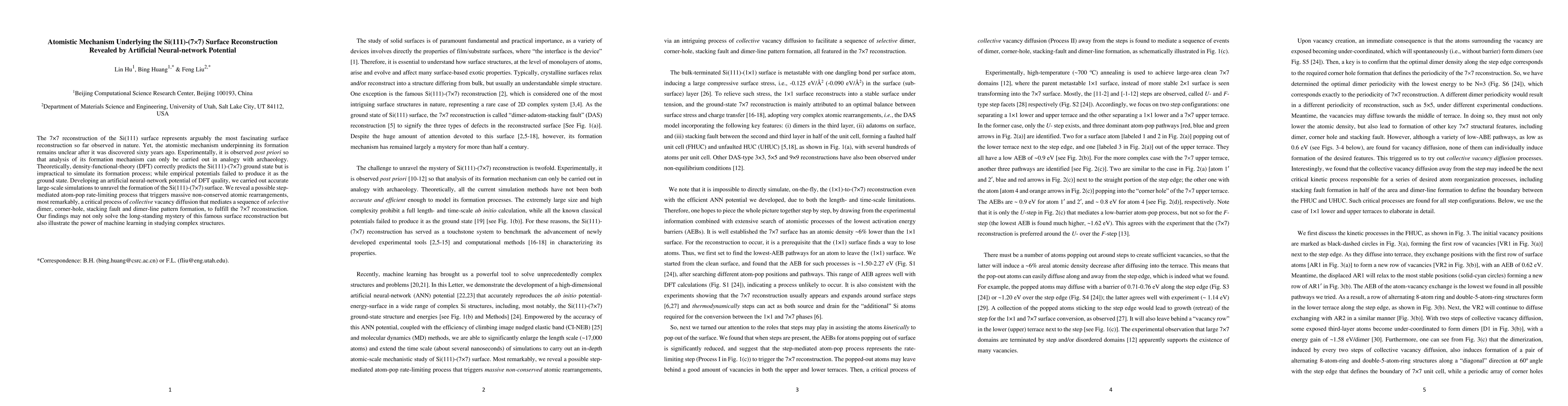 This study reveals the atomistic mechanism of the Si(111)-(7×7) surface reconstruction using an artificial neural-network potential, demonstrating a step-mediated, rate-limiting process and collective vacancy diffusion leading to the formation of the 7×7 pattern. This research solves a sixty-year-old mystery and showcases the potential of machine learning in complex structural analysis.
