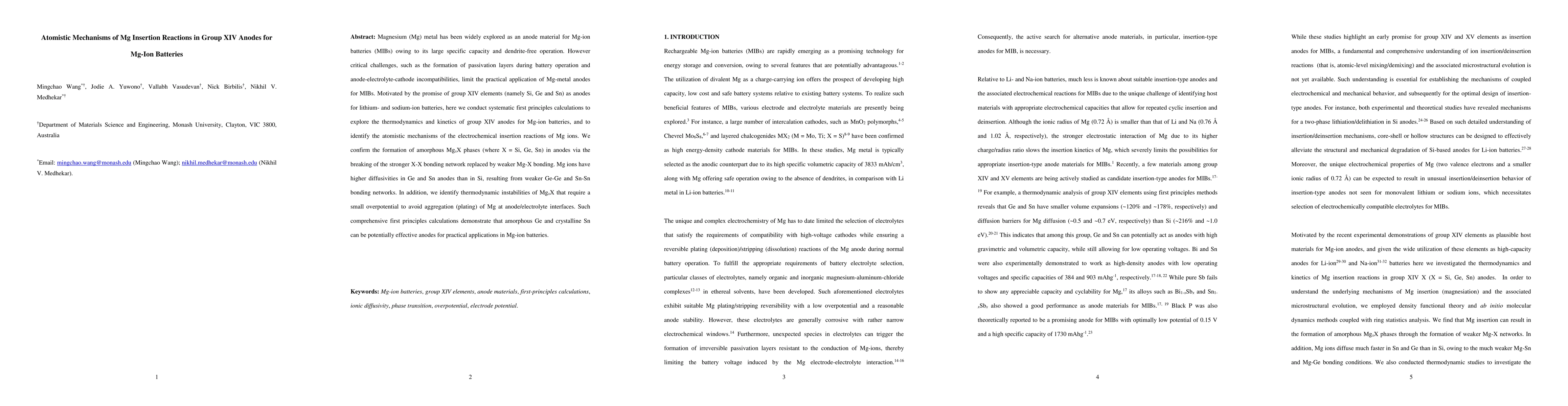 This study uses first principles calculations to explore Mg insertion reactions in group XIV anodes (Si, Ge, Sn) for Mg-ion batteries, identifying atomistic mechanisms and thermodynamic/kinetic behaviors. The research finds that Ge and Sn, due to weaker bonding, may offer higher Mg ion diffusivities and potential effectiveness as anodes, despite thermodynamic instabilities requiring small overpotentials.