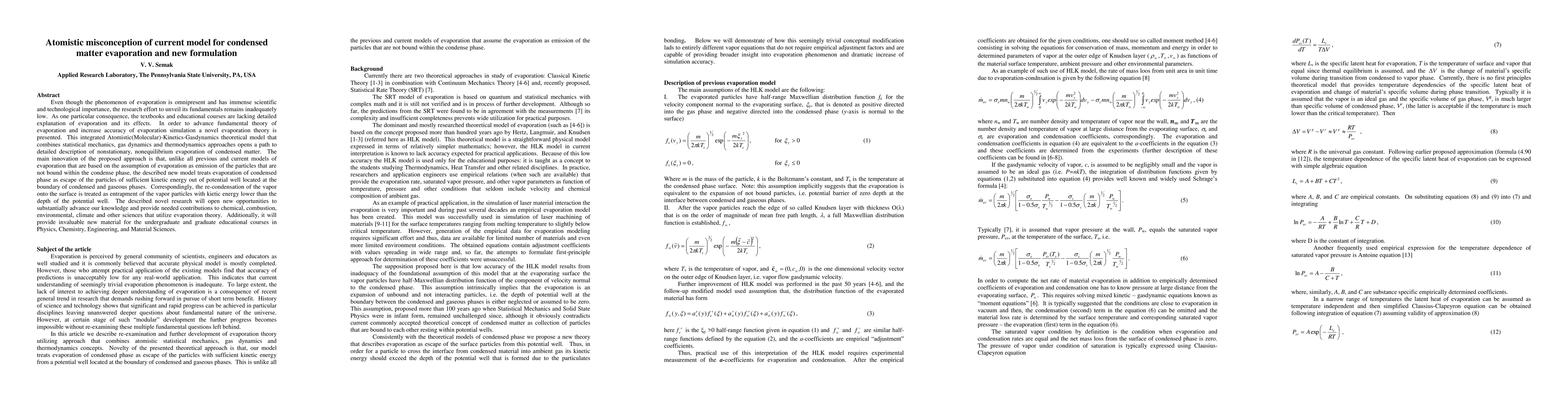 Even though the phenomenon of evaporation is omnipresent and has immense scientific and technological importance, the research effort to unveil its fundamentals remains inadequately low. As one particular consequence, the textbooks and educational courses are lacking detailed explanation of evaporation and its effects. In order to advance fundamental theory of evaporation and increase accuracy of evaporation simulation a novel evaporation theory is presented. This integrated Atomistic(Molecular)-Kinetics-Gasdynamics theoretical model that combines statistical mechanics, gas dynamics and thermodynamics approaches opens a path to detailed description of nonstationary, nonequilibrium evaporation of condensed matter. The main innovation of the proposed approach is that, unlike all previous and current models of evaporation that are based on the assumption of evaporation as emission of the particles that are not bound within the condense phase, the described new model treats evaporation of condensed phase as escape of the particles of sufficient kinetic energy out of potential well located at the boundary of condensed and gaseous phases. Correspondingly, the re-condensation of the vapor onto the surface is treated as entrapment of the vapor particles with kietic energy lower than the depth of the potential well. The described novel research will open new opportunities to substantially advance our knowledge and provide needed contributions to chemical, combustion, environmental, climate and other sciences that utilize evaporation theory. Additionally, it will provide invaluable new material for the undergraduate and graduate educational courses in Physics, Chemistry, Engineering, and Material Sciences.