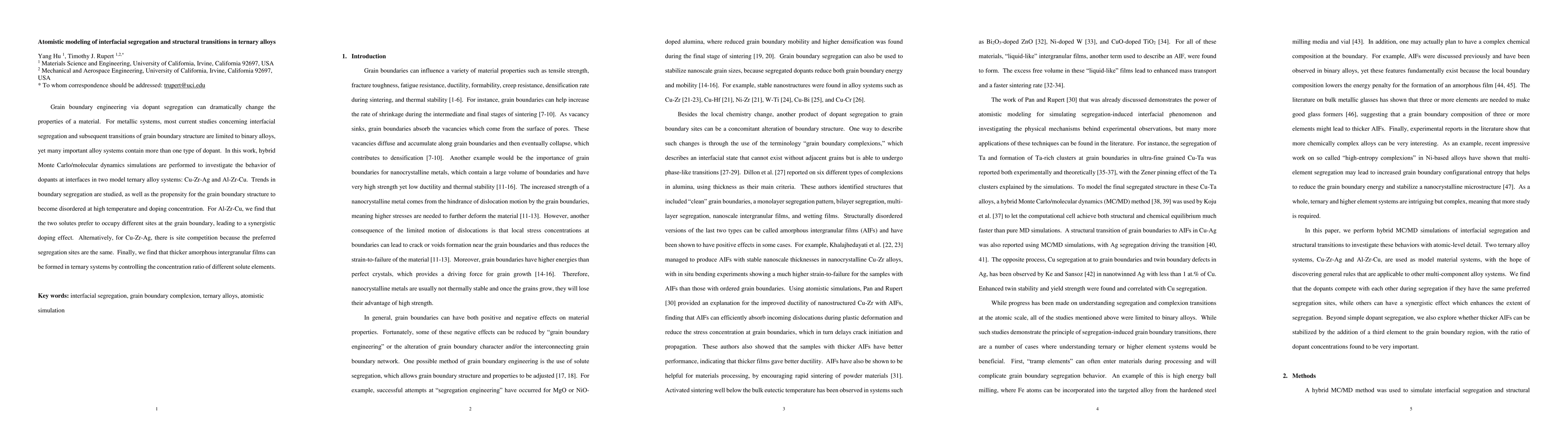 This study uses hybrid Monte Carlo/molecular dynamics simulations to explore the segregation behavior and structural transitions at grain boundaries in ternary alloy systems, such as Cu-Zr-Ag and Al-Zr-Cu. The research reveals distinct segregation trends and competitive site occupation, leading to different effects on grain boundary disorder and the formation of amorphous intergranular films.