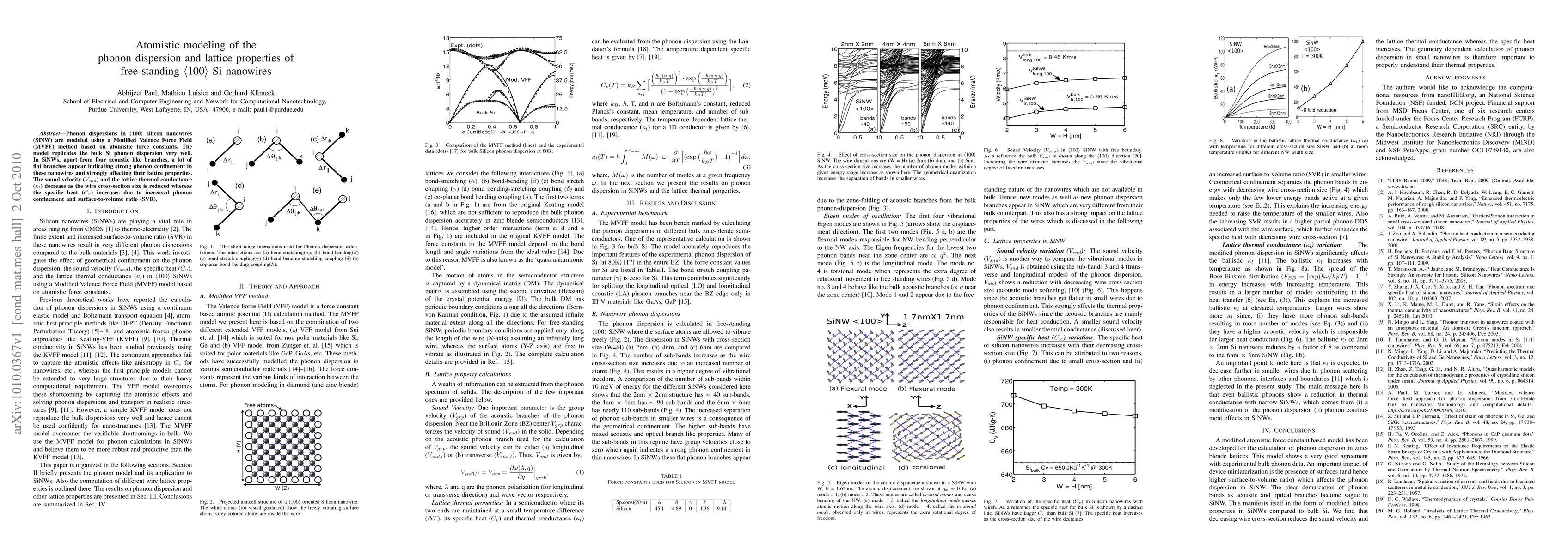 This paper models phonon dispersions in <100> silicon nanowires using a Modified Valence Force Field method, revealing strong phonon confinement and flat branches. As the nanowire size decreases, sound velocity and lattice thermal conductance drop, while specific heat increases due to enhanced phonon confinement and higher surface-to-volume ratio.