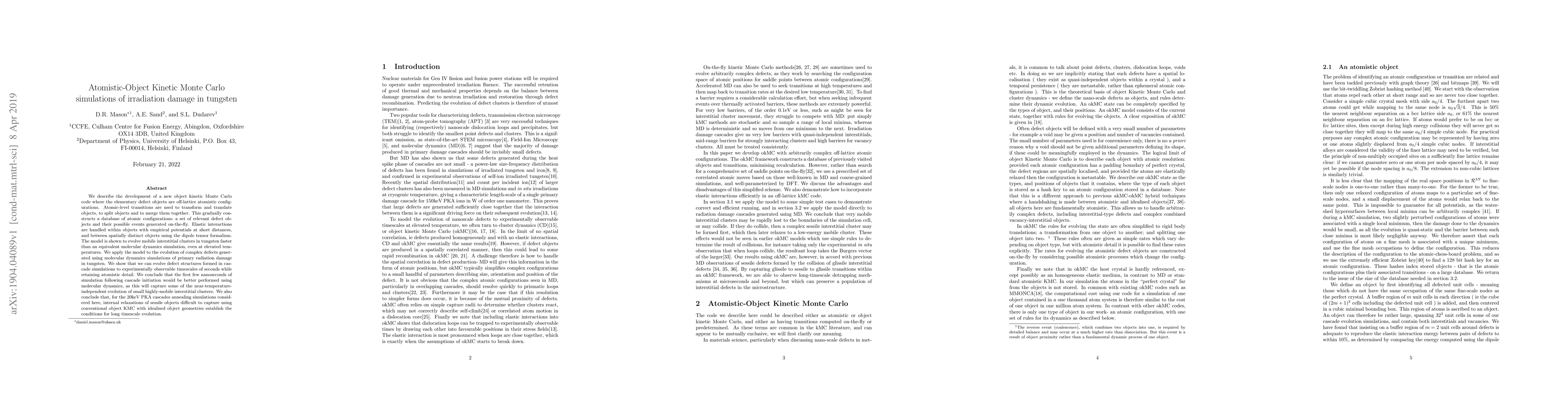 The research describes the development of a new off-lattice atomistic-object kinetic Monte Carlo (KMC) code for simulating irradiation damage in tungsten. The code uses atomic-level transitions to transform and translate objects, split objects, and merge them, gradually constructing a database of atomic configurations.
