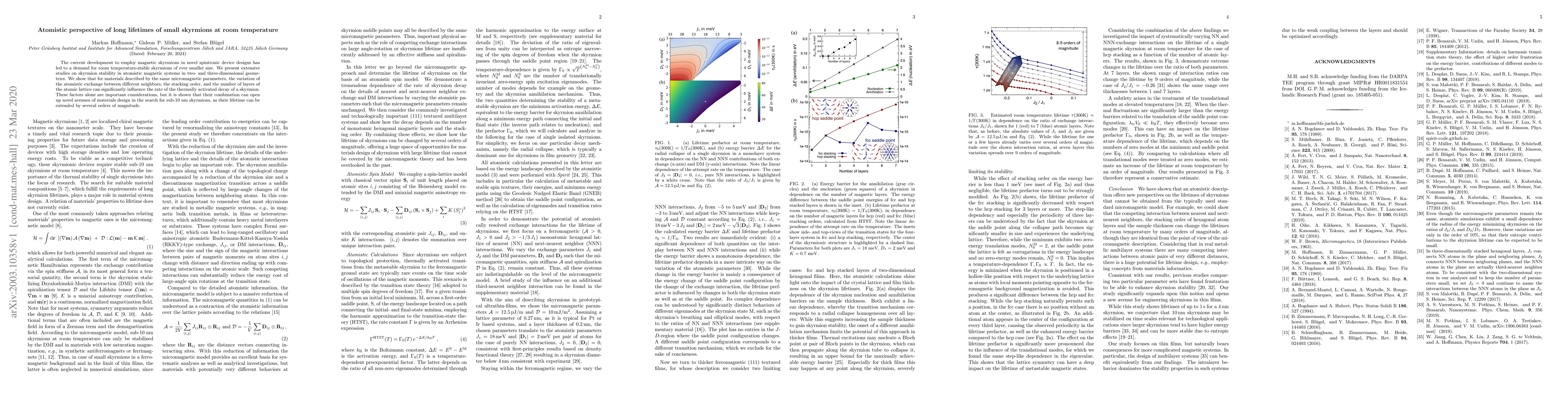 This paper investigates the stability of small magnetic skyrmions at room temperature, revealing that variations in atomistic exchange, stacking order, and layer number in magnetic materials can significantly affect skyrmion decay rates. The study suggests that optimizing these factors can lead to the development of materials with skyrmions that have lifetimes extended by several orders of magnitude, crucial for spintronic applications.