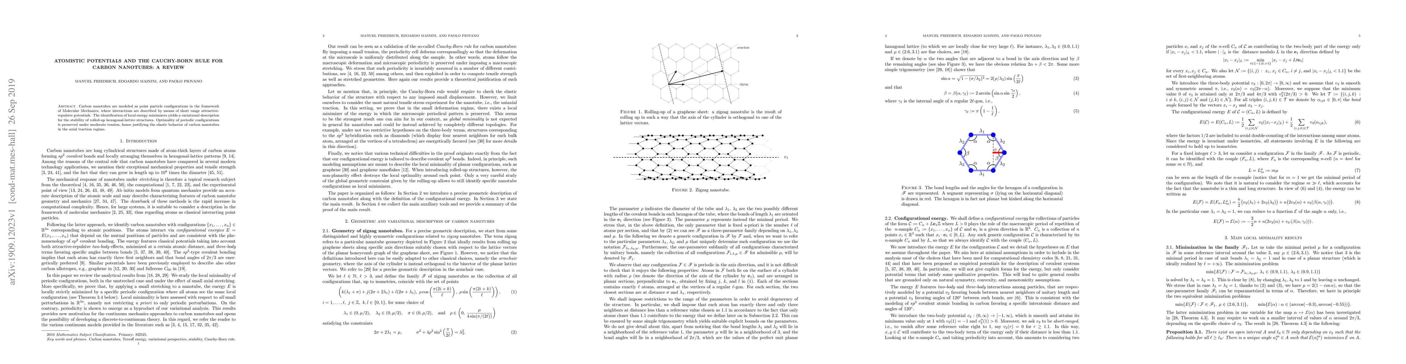 This paper reviews the use of atomistic potentials and the Cauchy-Born rule to model carbon nanotubes within Molecular Mechanics, demonstrating that local energy minimizers provide a variational description for their stability, and confirming the elastic behavior of carbon nanotubes under axial tension.