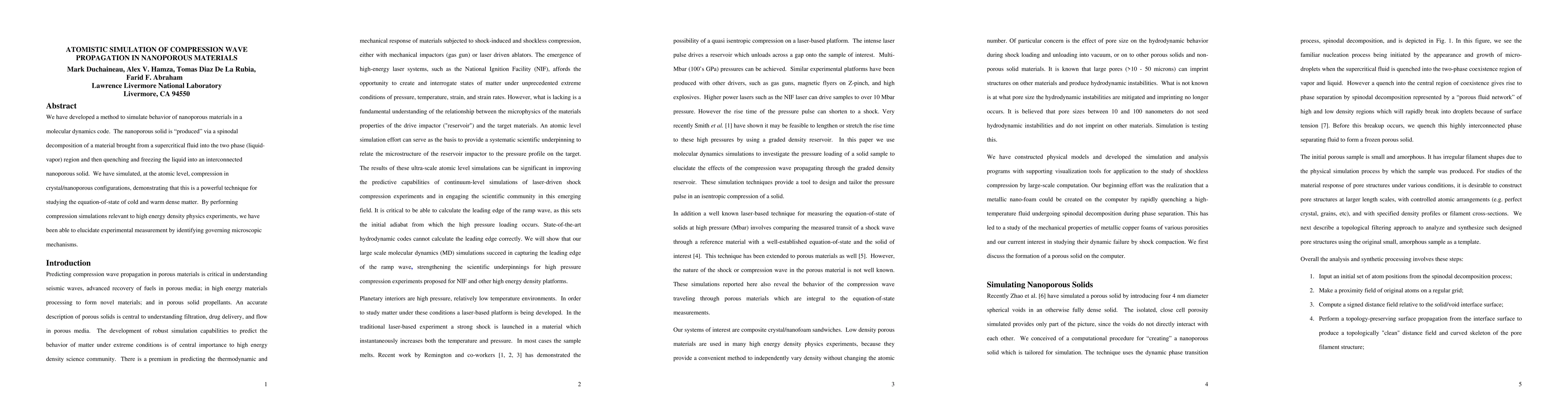 We have developed a method to simulate behavior of nanoporous materials in a molecular dynamics code. The nanoporous solid is produced via a spinodal decomposition of a material brought from a supercritical fluid into the two phase (liquid-vapor) region and then quenching and freezing the liquid into an interconnected nanoporous solid. We have simulated, at the atomic level, compression in crystal/nanoporous configurations, demonstrating that this is a powerful technique for studying the equation-of-state of cold and warm dense matter. By performing compression simulations relevant to high energy density physics experiments, we have been able to elucidate experimental measurement by identifying governing microscopic mechanisms.