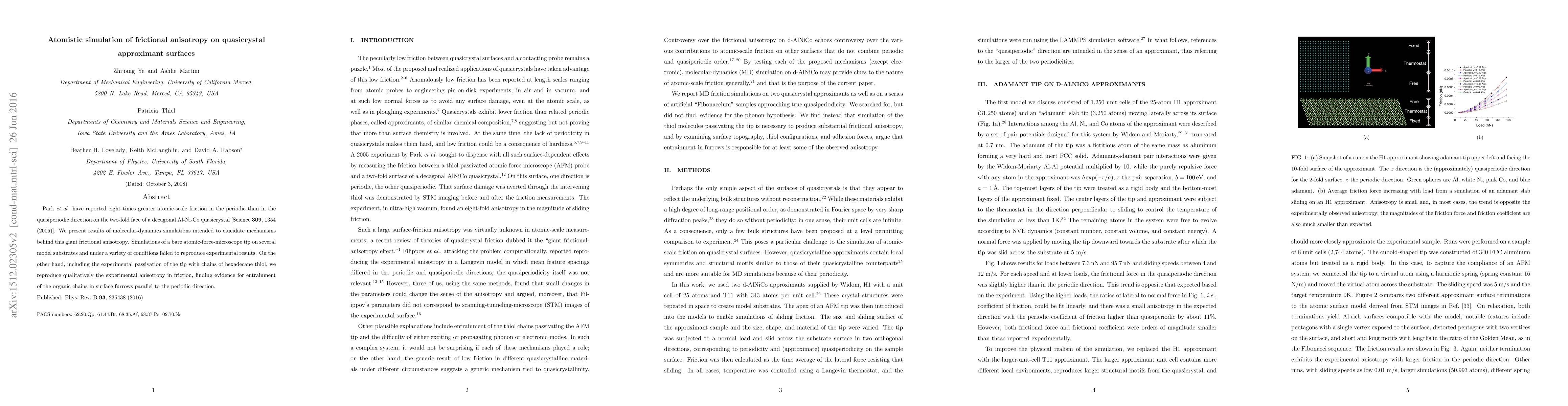 Park {\it et al.} have reported eight times greater atomic-scale friction in the periodic than in the quasiperiodic direction on the two-fold face of a decagonal Al-Ni-Co quasicrystal. We present results of molecular-dynamics simulations intended to elucidate mechanisms behind this giant frictional anisotropy. Simulations of a bare atomic-force-microscope tip on several model substrates and under a variety of conditions failed to reproduce experimental results. On the other hand, including the experimental passivation of the tip with chains of hexadecane thiol, we reproduce qualitatively the experimental anisotropy in friction, finding evidence for entrainment of the organic chains in surface furrows parallel to the periodic direction.
