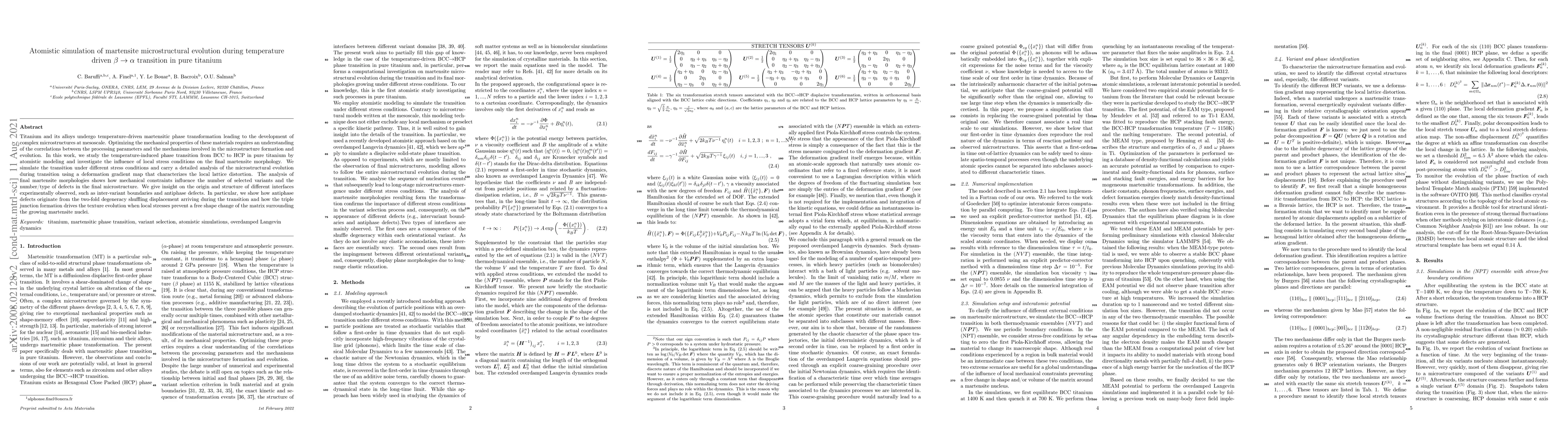 This paper uses atomistic simulations to study the martensitic phase transition in pure titanium from BCC to HCP, focusing on the influence of local stress on the resulting microstructure. The research reveals how mechanical constraints affect the number of martensite variants and defect types, providing insights into the origins of experimentally observed interfaces.