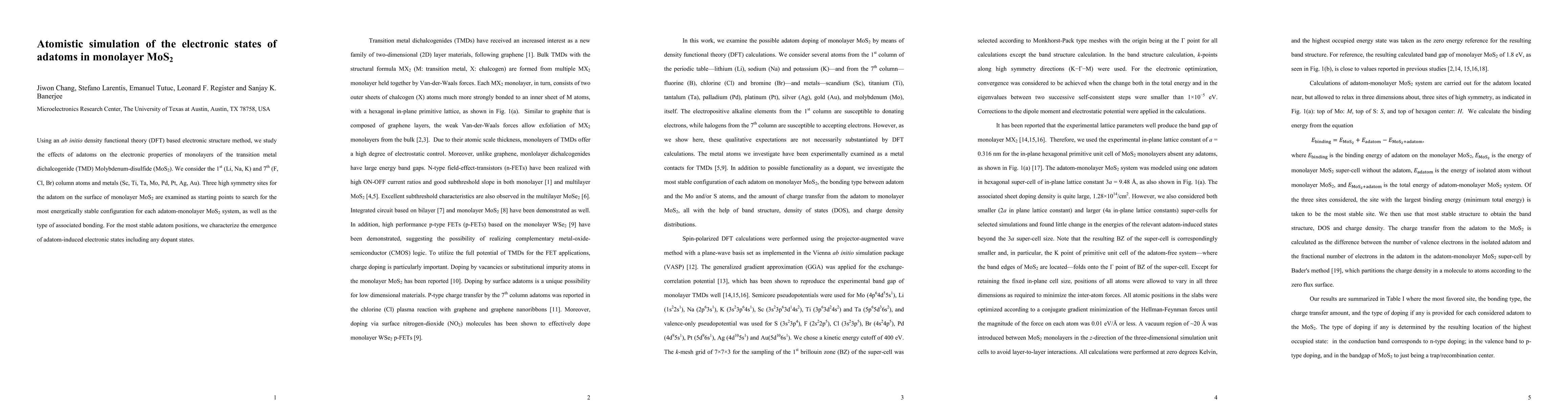 This paper uses ab initio DFT to investigate how various adatoms affect the electronic properties of monolayer MoS2, examining both alkali and halogen atoms and metals. It identifies the most stable adatom configurations and analyzes the resulting electronic states, including any dopant states induced by the adatoms.