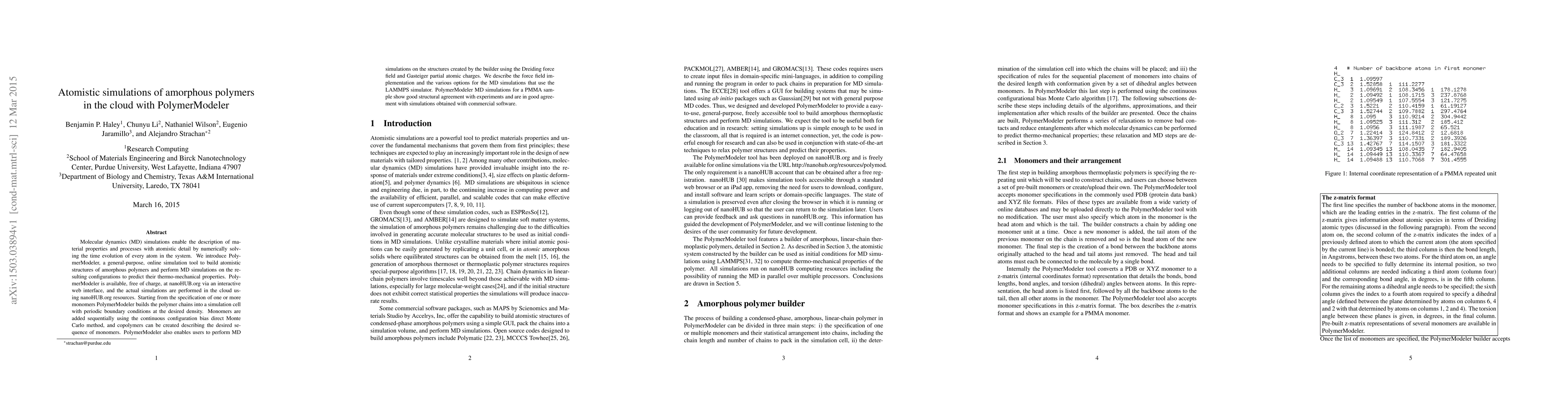 Molecular dynamics (MD) simulations enable the description of ma- terial properties and processes with atomistic detail by numerically solv- ing the time evolution of every atom in the system. We introduce Poly- merModeler, a general-purpose, online simulation tool to build atomistic structures of amorphous polymers and perform MD simulations on the re- sulting configurations to predict their thermo-mechanical properties. Poly- merModeler is available, free of charge, at nanoHUB.org via an interactive web interface, and the actual simulations are performed in the cloud us- ing nanoHUB.org resources. Starting from the specification of one or more monomers PolymerModeler builds the polymer chains into a simulation cell with periodic boundary conditions at the desired density. Monomers are added sequentially using the continuous configuration bias direct Monte Carlo method, and copolymers can be created describing the desired se- quence of monomers. PolymerModeler also enables users to perform MD simulations on the structures created by the builder using the Dreiding force field and Gasteiger partial atomic charges. We describe the force field im- plementation and the various options for the MD simulations that use the LAMMPS simulator. PolymerModeler MD simulations for a PMMA sam- ple show good structural agreement with experiments and are in good agree- ment with simulations obtained with commercial software.