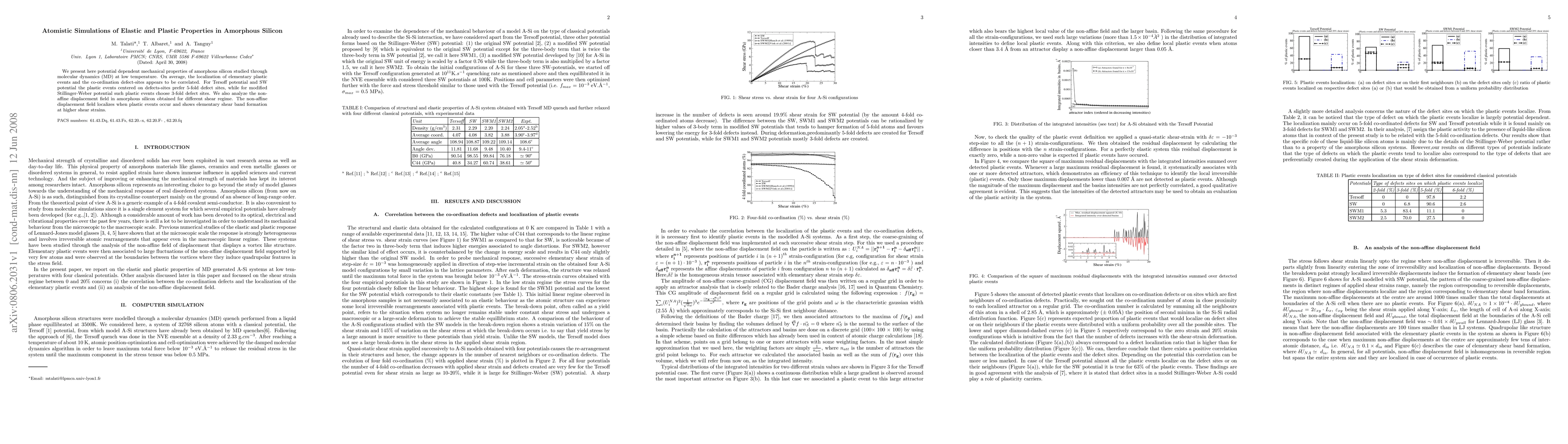 The paper presents a detailed analysis of potential-dependent mechanical properties in amorphous silicon using molecular dynamics simulations, highlighting the correlation between plastic events and coordination defect sites.