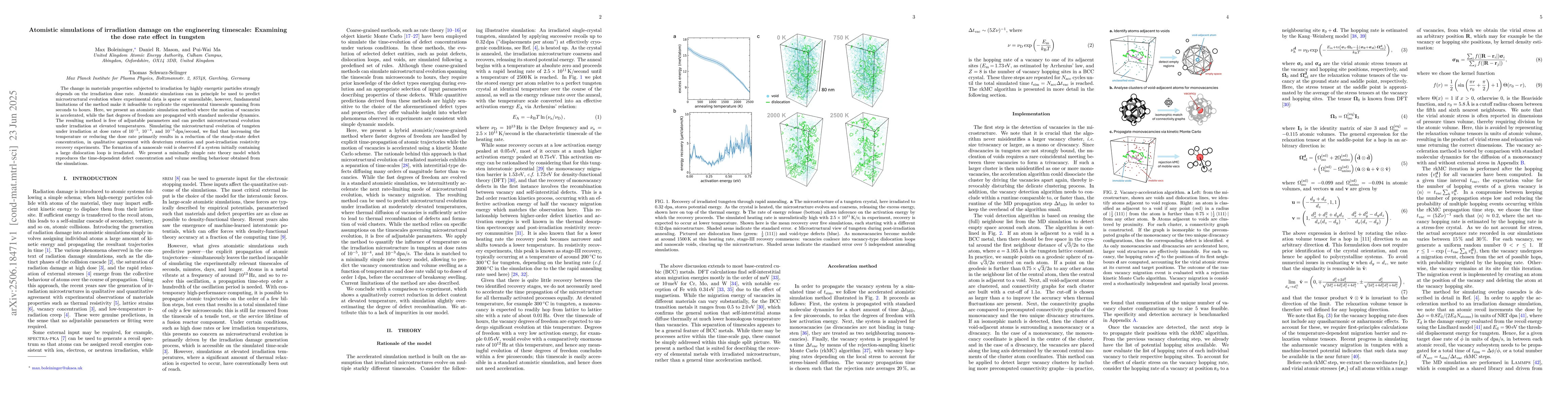 This research introduces an accelerated atomistic simulation method for predicting tungsten's microstructural changes under irradiation at elevated temperatures and various dose rates. Results show that higher temperature or lower dose rates decrease steady-state defect concentrations, with potential void formation from large dislocation loops under irradiation. A simple rate theory model aligns with the simulation findings on defect concentration and swelling behavior.