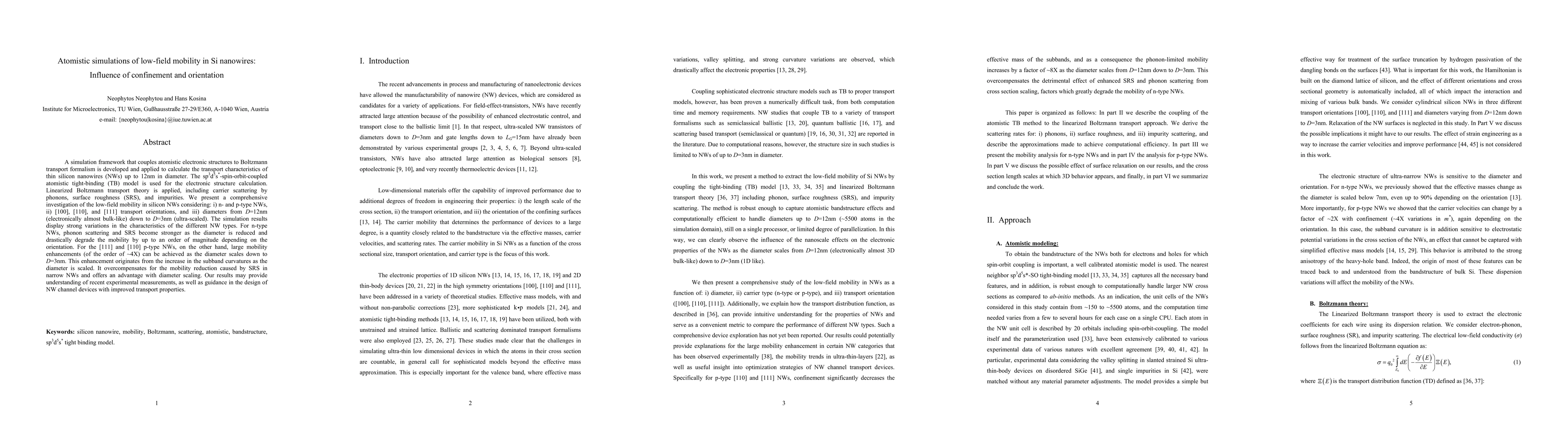 This study investigates low-field mobility in silicon nanowires with varying diameters and orientations, revealing strong variations in transport characteristics and potential for enhanced mobility through diameter scaling.
