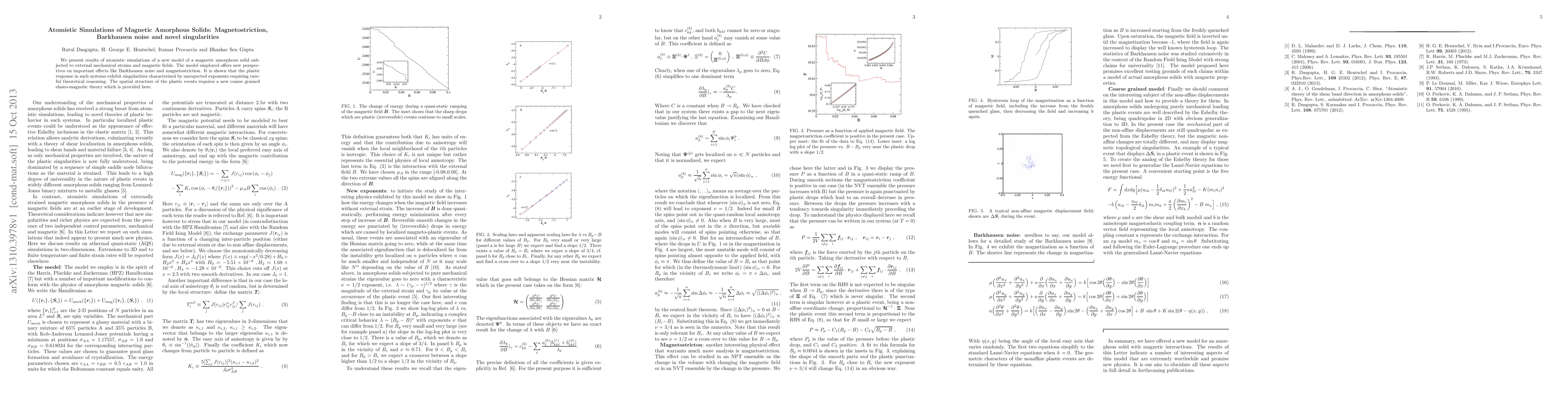 We present results of atomistic simulations of a new model of a magnetic amorphous solid subjected to external mechanical strains and magnetic fields. The model employed offers new perspectives on important effects like Barkhausen noise and magnetostriction. It is shown that the plastic response in such systems exhibit singularities characterized by unexpected exponents requiring careful theoretical reasoning. The spatial structure of the plastic events requires a new coarse grained elasto-magnetic theory which is provided here.