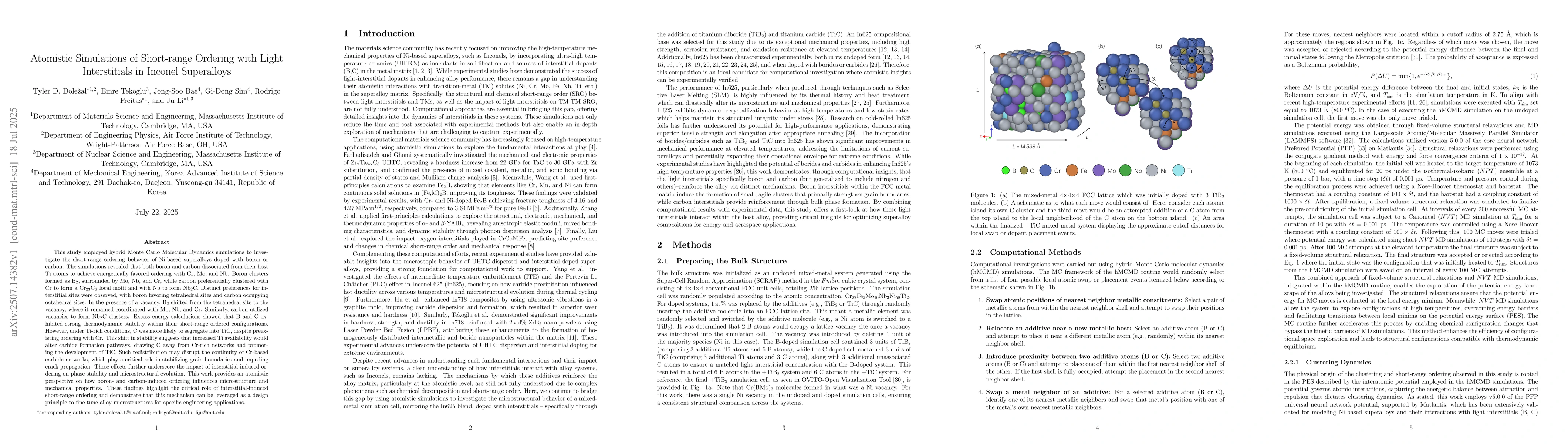 This study employed hybrid Monte Carlo Molecular Dynamics simulations to investigate the short-range ordering behavior of Ni-based superalloys doped with boron or carbon. The simulations revealed that both boron and carbon dissociated from their host Ti atoms to achieve energetically favored ordering with Cr, Mo, and Nb. Boron clusters formed as B2, surrounded by Mo, Nb, and Cr, while carbon preferentially clustered with Cr to form a Cr23C6 local motif and with Nb to form Nb2C. Distinct preferences for interstitial sites were observed, with boron favoring tetrahedral sites and carbon occupying octahedral sites. In the presence of a vacancy, B2 shifted from the tetrahedral site to the vacancy, where it remained coordinated with Mo, Nb, and Cr. Similarly, carbon utilized vacancies to form Nb2C clusters. Excess energy calculations showed that B and C exhibited strong thermodynamic stability within their short-range ordered configurations. However, under Ti-rich conditions, C was more likely to segregate into TiC, despite preexisting ordering with Cr. This shift in stability suggests that increased Ti availability would alter carbide formation pathways, drawing C away from Cr-rich networks and promoting the development of TiC. Such redistribution may disrupt the continuity of Cr-based carbide networks, which play a critical role in stabilizing grain boundaries and impeding crack propagation. These effects further underscore the impact of interstitial-induced ordering on phase stability and microstructural evolution. This work provides an atomistic perspective on how boron- and carbon-induced ordering influences microstructure and mechanical properties. These findings highlight the critical role of interstitial-induced short-range ordering and demonstrate that this mechanism can be leveraged as a design principle to fine-tune alloy microstructures for specific engineering applications.