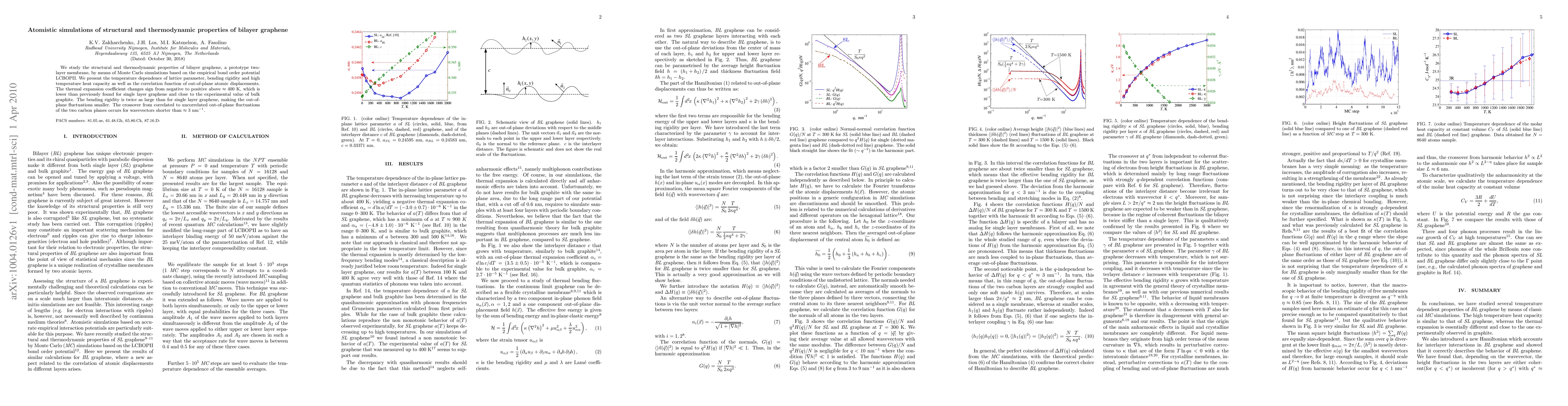 This paper uses Monte Carlo simulations to investigate the structural and thermodynamic properties of bilayer graphene, revealing a temperature-dependent thermal expansion coefficient and higher bending rigidity compared to single layer graphene. The study finds a crossover in out-of-plane atomic displacement correlations at wavevectors shorter than 3 nm$^{-1}$.