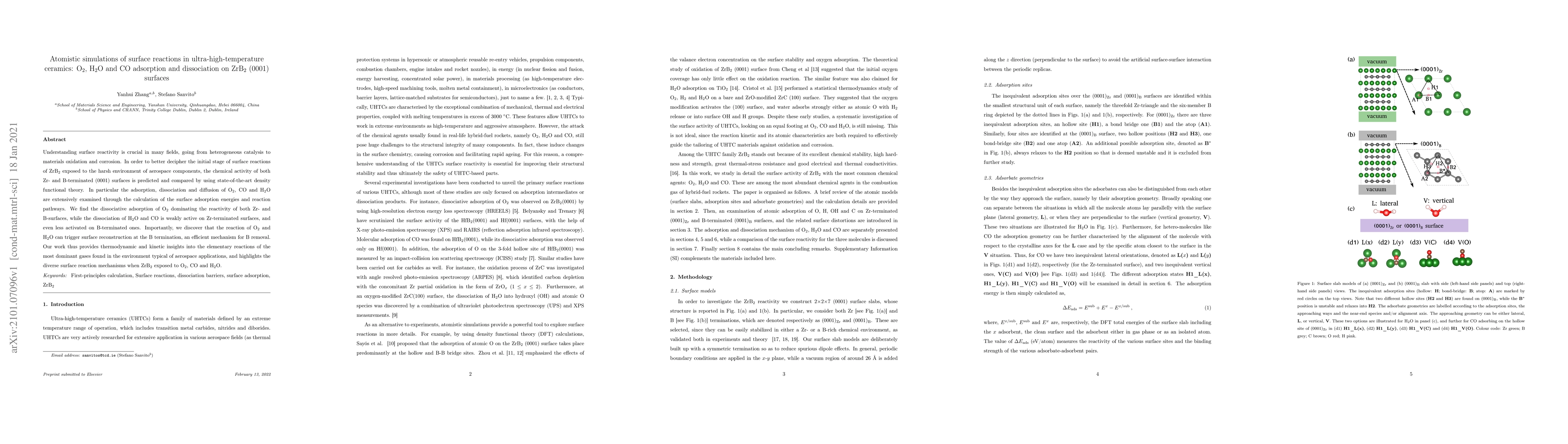 This study uses density functional theory to investigate the adsorption and dissociation of O2, H2O, and CO on ZrB2 surfaces, revealing that O2 dissociative adsorption dominates reactivity, while H2O and CO show weak activity, especially on B-terminated surfaces. The research highlights significant surface reconstruction triggered by O2 and H2O interactions on B-surfaces.
