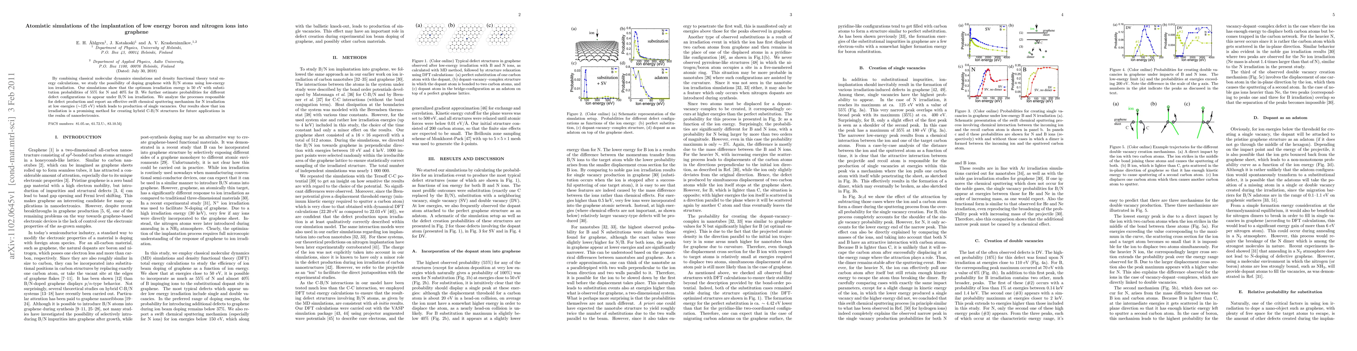 By combining classical molecular dynamics simulations and density functional theory total energy calculations, we study the possibility of doping graphene with B/N atoms using low-energy ion irradiation. Our simulations show that the optimum irradiation energy is 50 eV with substitution probabilities of 55% for N and 40% for B. We further estimate probabilities for different defect configurations to appear under B/N ion irradiation. We analyze the processes responsible for defect production and report an effective swift chemical sputtering mechanism for N irradiation at low energies (~125 eV) which leads to production of single vacancies. Our results show that ion irradiation is a promising method for creating hybrid C-B/N structures for future applications in the realm of nanoelectronics.