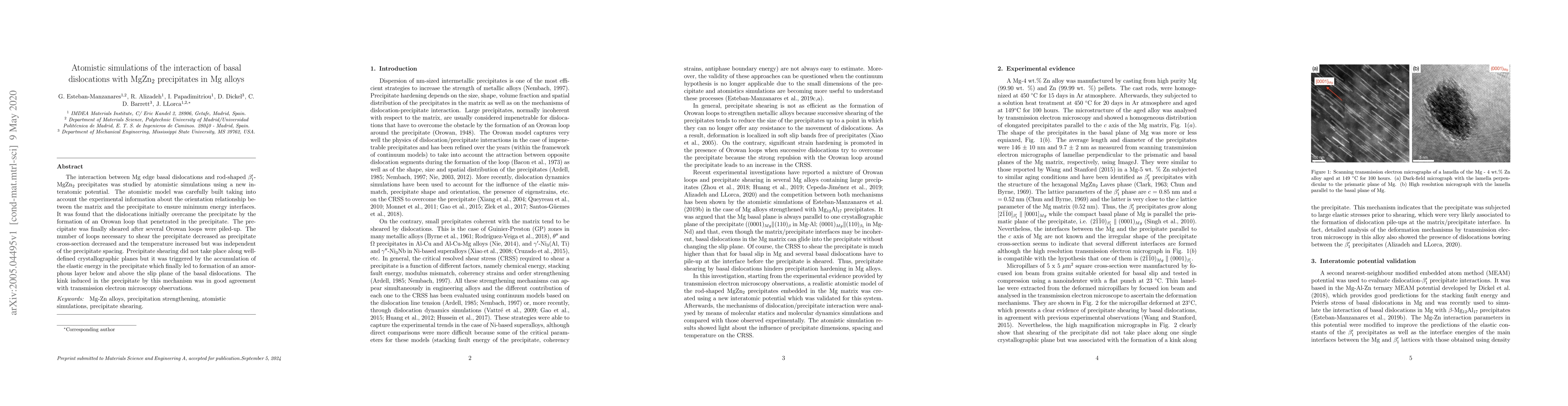 The interaction between Mg edge basal dislocations and rod-shaped $\beta_1'$-MgZn$_2$ precipitates was studied by atomistic simulations using a new interatomic potential. The atomistic model was carefully built taking into account the experimental information about the orientation relationship between the matrix and the precipitate to ensure minimum energy interfaces. It was found that the dislocations initially overcame the precipitate by the formation of an Orowan loop that penetrated in the precipitate. The precipitate was finally sheared after several Orowan loops were piled-up. The number of loops necessary to shear the precipitate decreased as precipitate cross-section decreased and the temperature increased but was independent of the precipitate spacing. Precipitate shearing did not take place along well-defined crystallographic planes but it was triggered by the accumulation of the elastic energy in the precipitate which finally led to formation of an amorphous layer below and above the slip plane of the basal dislocations. The kink induced in the precipitate by this mechanism was in good agreement with transmission electron microscopy observations.