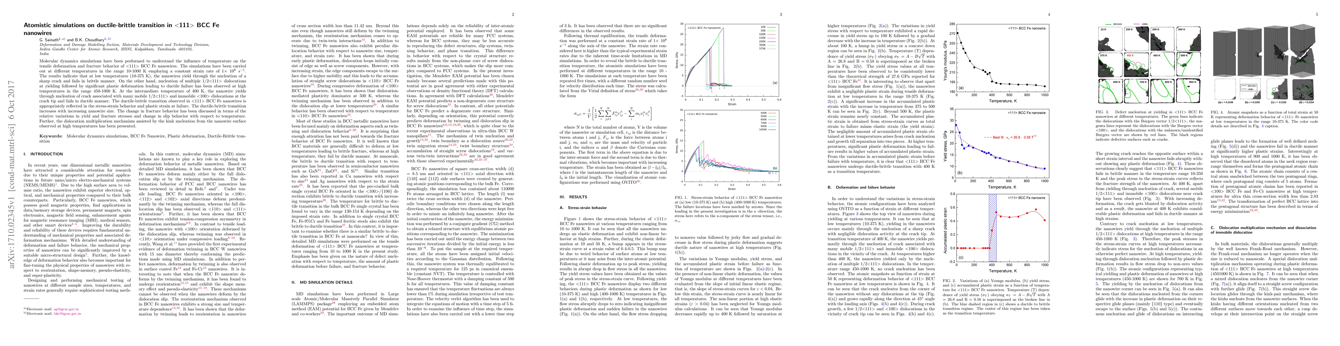 Molecular dynamics simulations reveal the ductile-brittle transition in <111> BCC Fe nanowires, showing brittle failure at low temperatures and ductile failure at high temperatures due to dislocation mechanisms. The transition is size-dependent and influenced by temperature-induced changes in yield and fracture stresses.