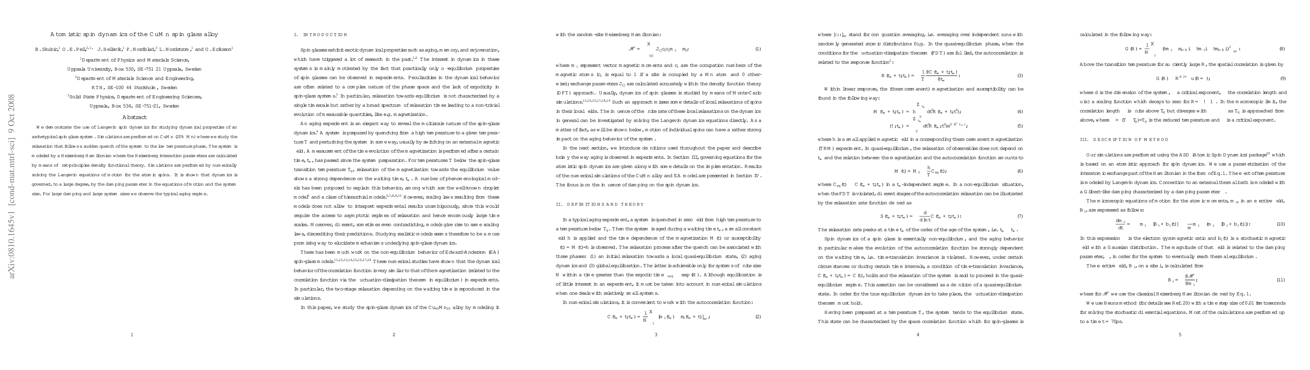 We demonstrate the use of Langevin spin dynamics for studying dynamical properties of an archetypical spin glass system. Simulations are performed on CuMn (20% Mn) where we study the relaxation that follows a sudden quench of the system to the low temperature phase. The system is modeled by a Heisenberg Hamiltonian where the Heisenberg interaction parameters are calculated by means of first-principles density functional theory. Simulations are performed by numerically solving the Langevin equations of motion for the atomic spins. It is shown that dynamics is governed, to a large degree, by the damping parameter in the equations of motion and the system size. For large damping and large system sizes we observe the typical aging regime.
