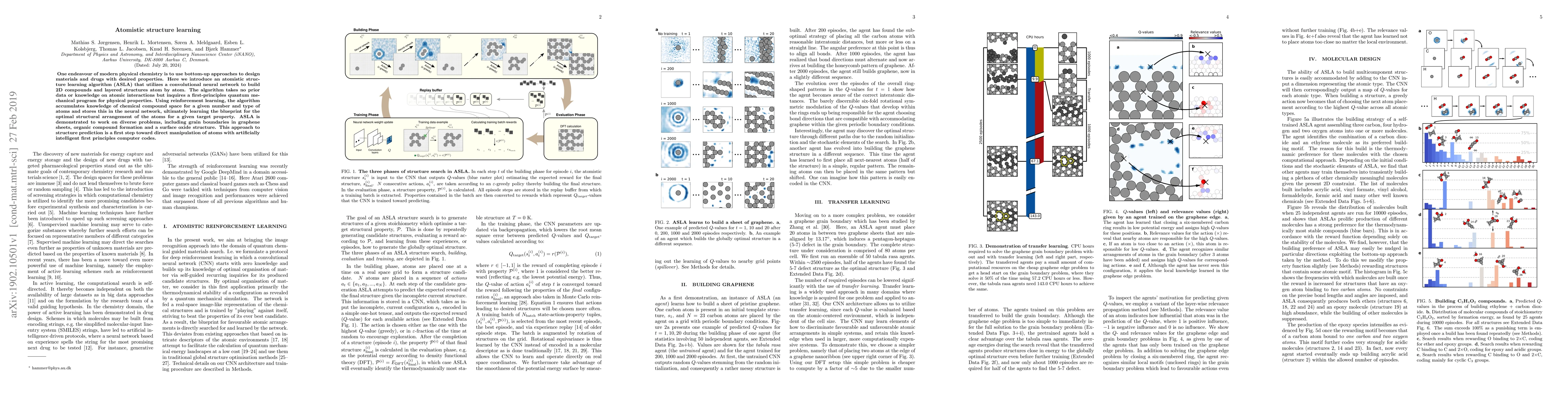 The research introduces Atomistic Structure Learning Algorithm (ASLA), a method using convolutional neural networks and reinforcement learning to construct atomic structures of 2D compounds and layered structures without prior data on atomic interactions. ASLA queries a quantum mechanical program for properties, learning optimal atom arrangements for target properties, and has been successfully applied to various problems like graphene grain boundaries, organic compounds, and surface oxide structures, marking a step towards AI-driven atomic manipulation.