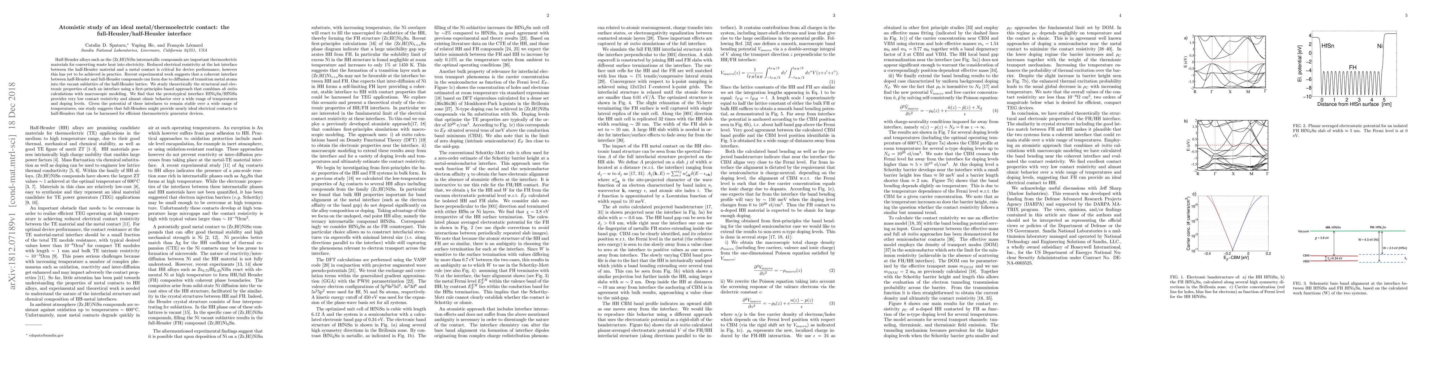 This paper investigates the structural and electronic properties of the interface between half-Heusler (HfNiSn) and full-Heusler (HfNi$_2$Sn) compounds using first-principles calculations. The study finds that this interface exhibits low contact resistivity and nearly ohmic behavior, suggesting it could serve as an ideal metal/thermoelectric contact for efficient thermoelectric devices.